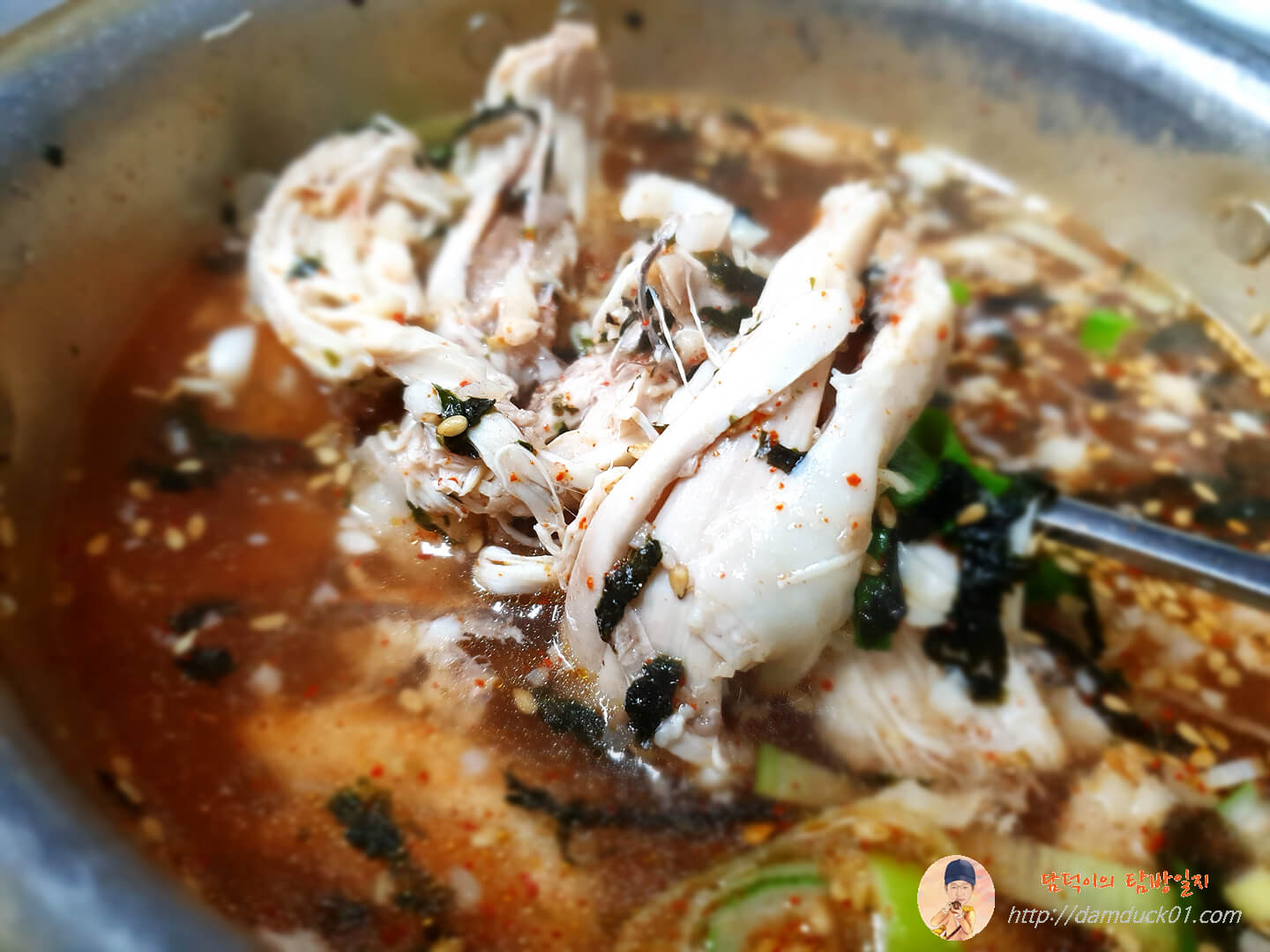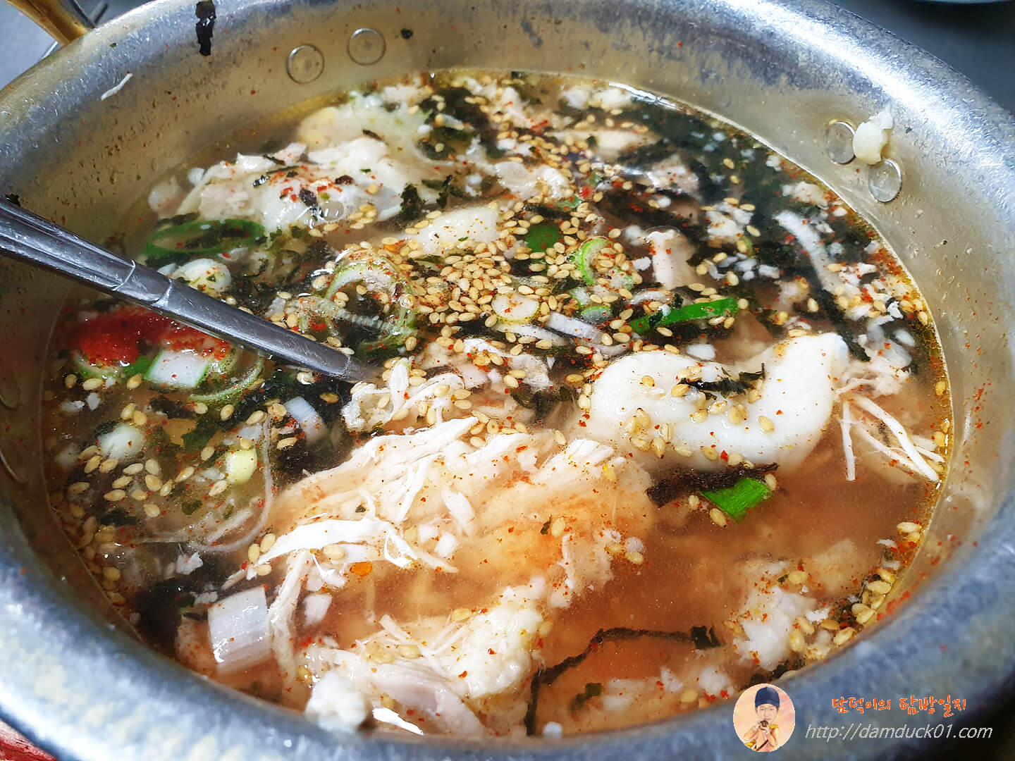 주문한 닭곰탕이 나왔습니다. 그릇은 칼국수와 동일한 양은 냄비이고 일단 첫인상은 칼국수와 비슷한데 면 대신 닭고기가 들어 있는 느낌입니다.