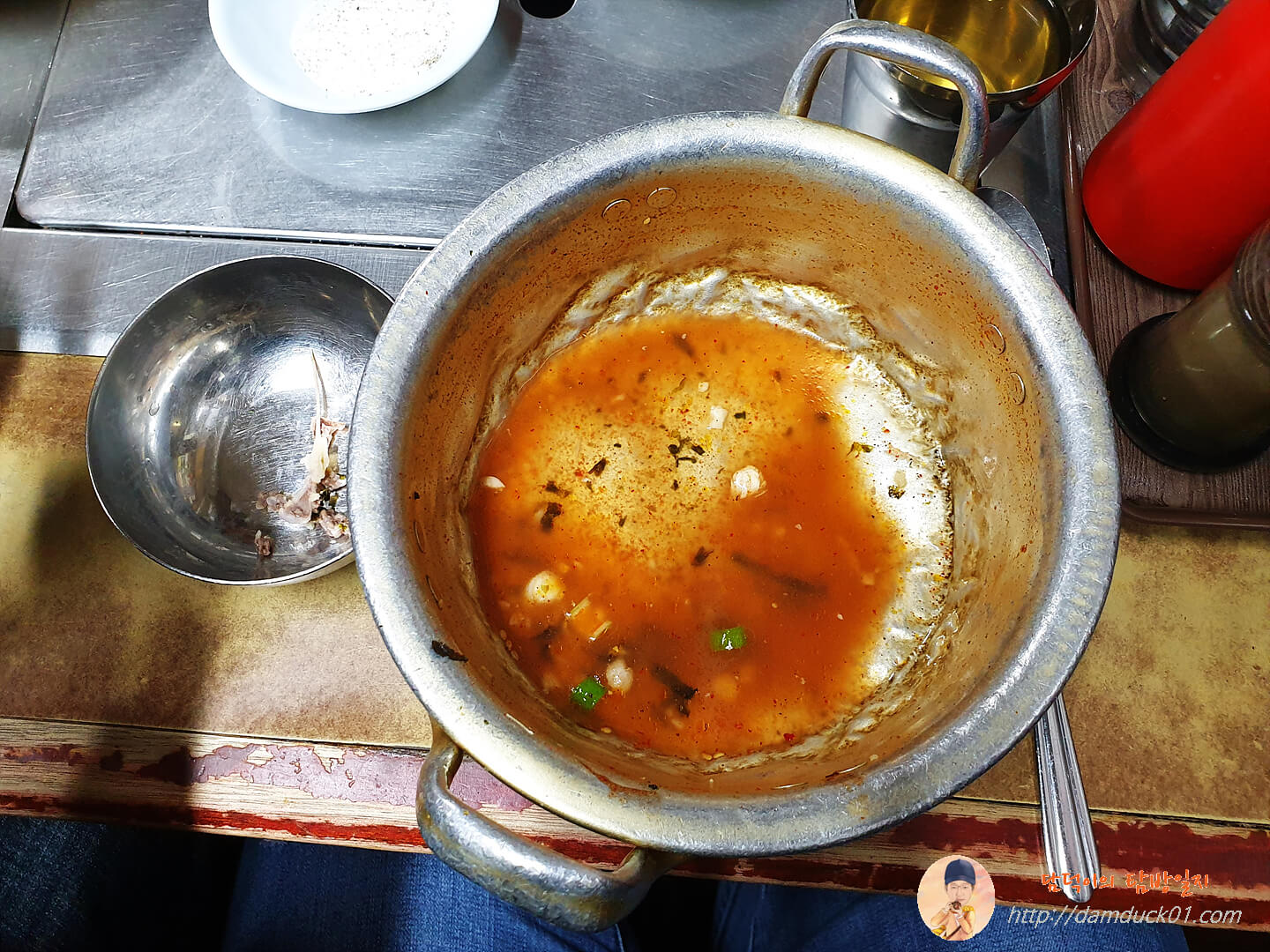 결국 싹~ 비웠습니다. 한 달 전 딱 한 번 먹었던 칼국수의 맛이 정확히 기억나지는 않지만 국물은 같은 닭고기를 넣고 끓여낸 같은 거 같고 양면도 비슷한 걸 사용했을 거 같은데 전에 먹었던 칼국수는 달걀을 넣어서 그런지 이렇게 매운맛을 느끼지는 못했는데 닭곰탕은 매운맛을 제대로 맛보고 왔네요. 먹고 나왔더니 속이 뜨끈한 게 잠시나마 추운 걸 잊을 수 있을 정도였습니다.