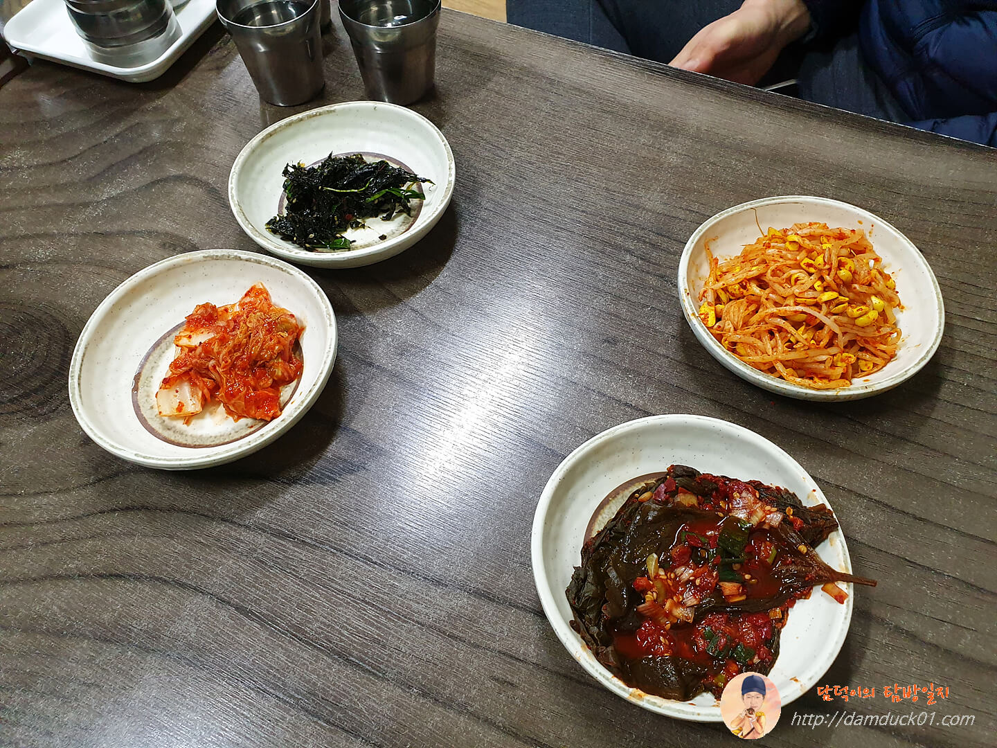 자리에는 반찬이 준비되어 있는데 파래무침이랑 배추김치, 콩나물 무침과 깻잎 장아찌까지.