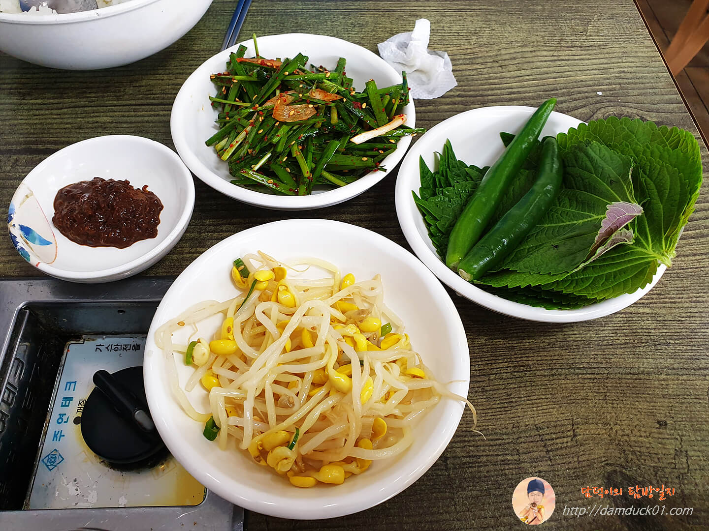 반찬은 쌈장과 부추무침, 콩나물 데친 거랑 깻잎 그리고 고추가 나왔는데 이건 반찬이라기보다 비빔밥 재료죠.