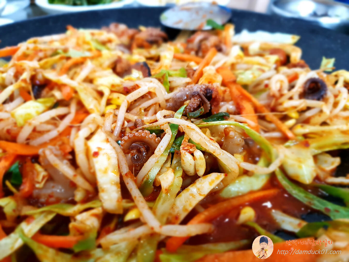 철판에서 자글자글 끓기 시작하면 주걱과 집게를 이용 밑에 있는 주꾸미와 콩나물은 올려주고 위에 있는 채소들은 아래로 내려주면서 끓여주세요.