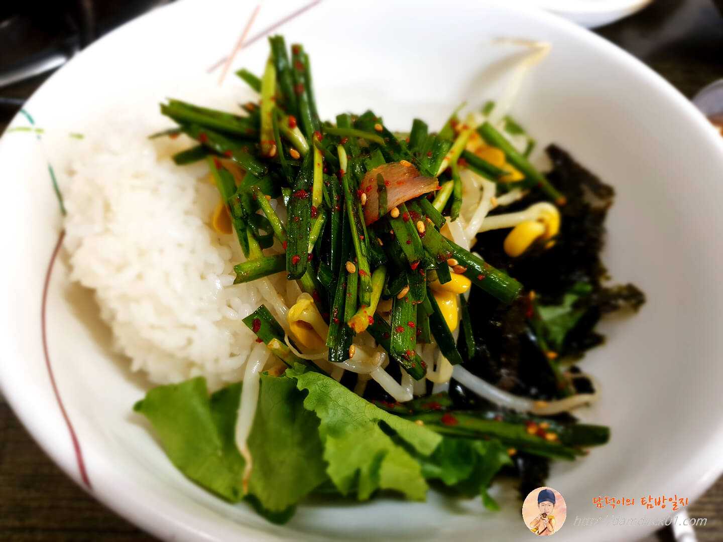 반찬은 쌈장과 부추무침, 콩나물 데친 거랑 깻잎 그리고 고추가 나왔는데 이건 반찬이라기보다 비빔밥 재료죠.