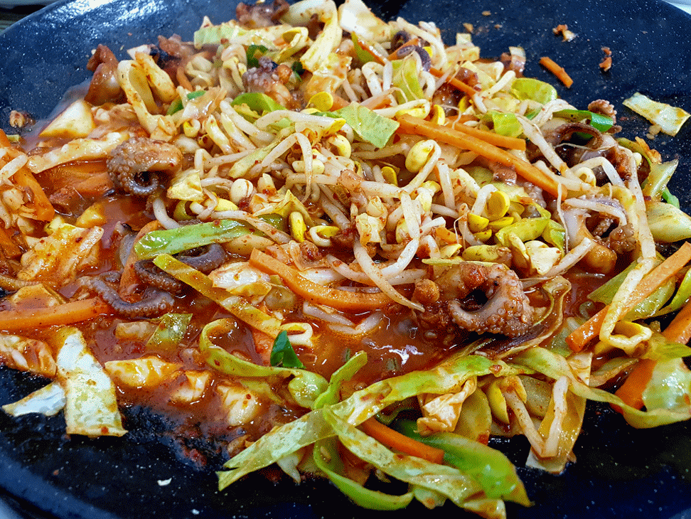 철판에서 자글자글 끓기 시작하면 주걱과 집게를 이용 밑에 있는 주꾸미와 콩나물은 올려주고 위에 있는 채소들은 아래로 내려주면서 끓여주세요.