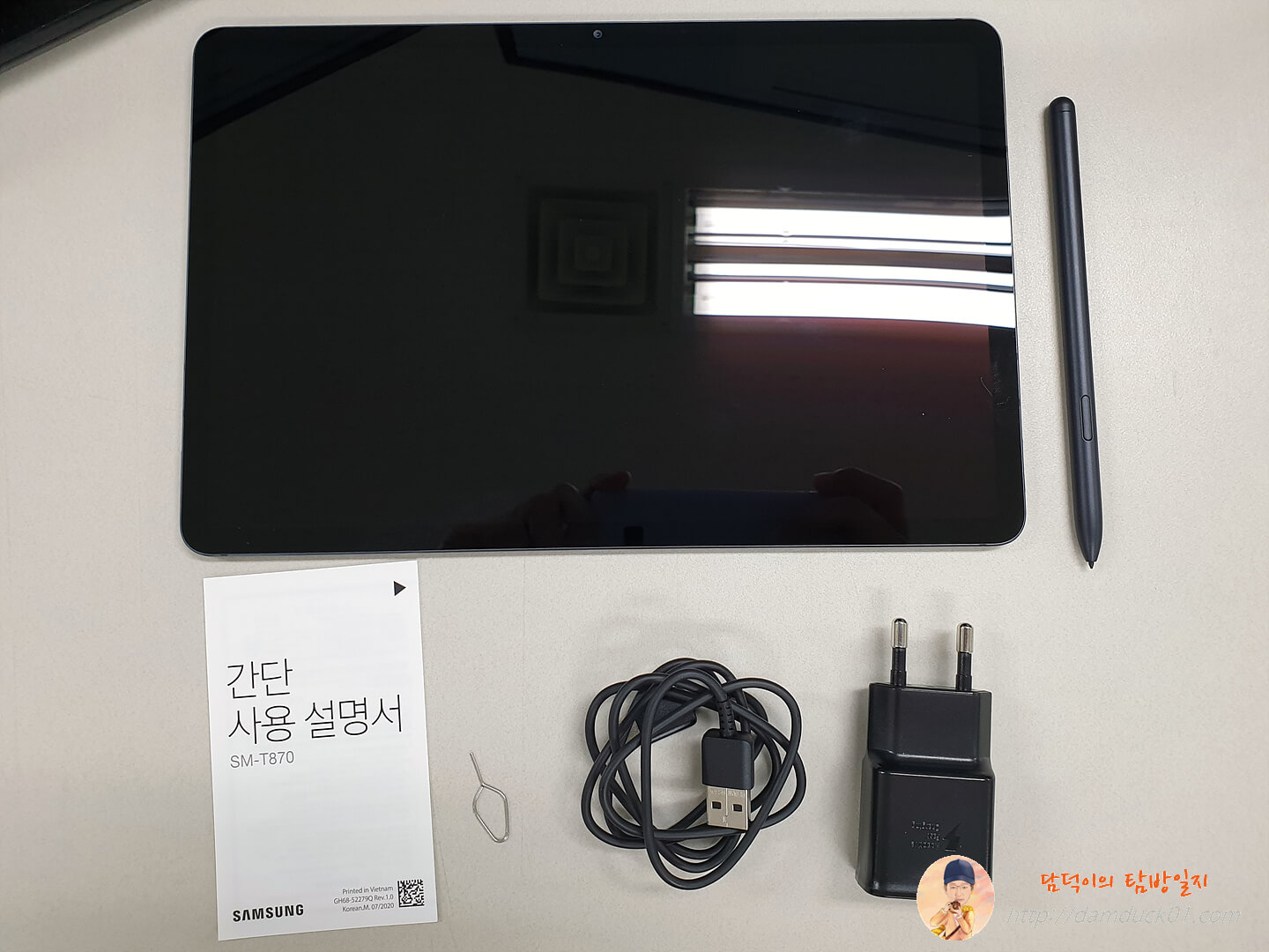 부직포에 감싸여 있는 갤럭시 탭 S7을 들어내면 이렇게 구성품이 깔끔하게 정리되어 있는 걸 확인할 수 있는데 오~ S펜이 제가 사용 중인 갤럭시 탭 S6의 S펜보다 그립감이 좋아 보입니다. 얼핏 보면 갤럭시 탭 S6 Lite용 S펜이랑 비슷한 거 같네요.