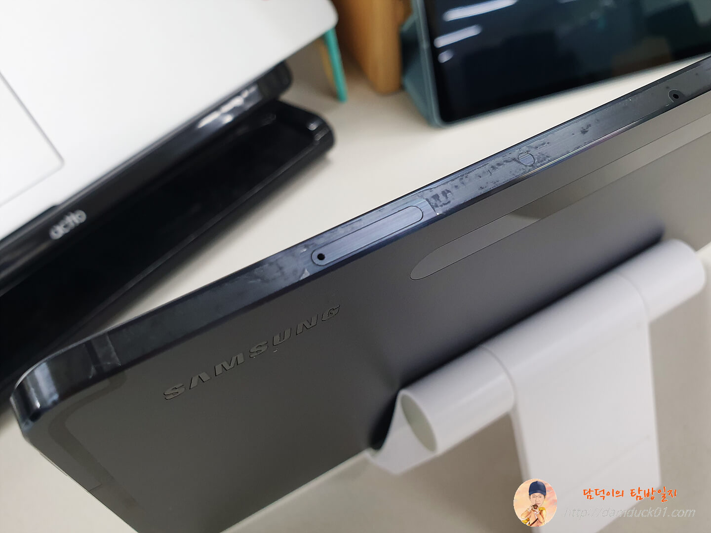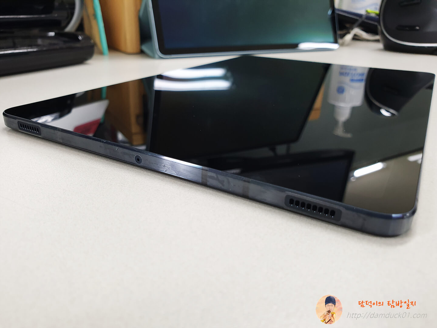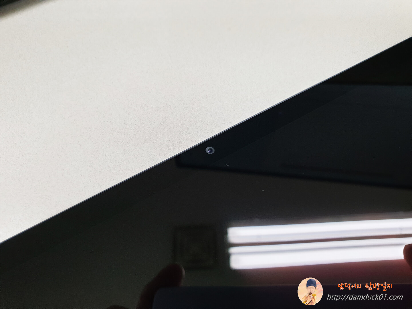 전면 카메라는 특이하게(?) 가로 기준으로 봤을 때 상단 중앙에 자리 잡고 있는데 갤럭시 탭의 주 사용을 기존처럼 세로가 아닌 가로 기준으로 권장하고 있는 듯한 느낌입니다. 저는 전면 카메라가 이 위치에 있는 것도 나쁘지는 않은 거 같아요.