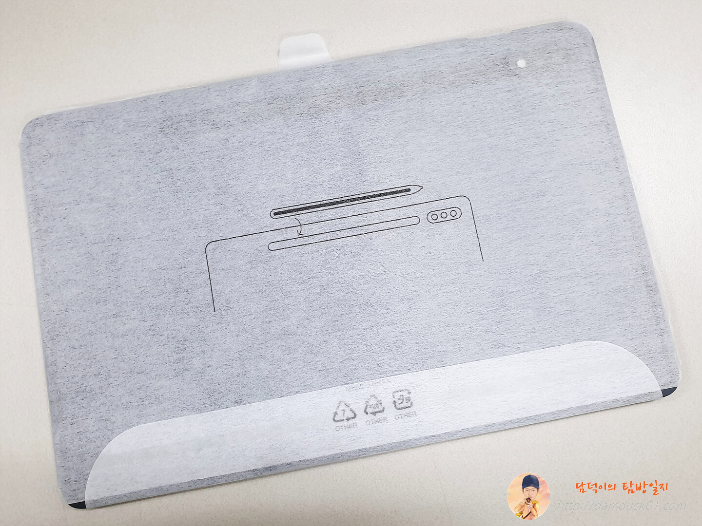 갤럭시 탭 S7의 부직포를 어떻게 뜯는 건지 상하좌우를 다 살펴봤는데 뒷면에 이렇게 뜯을 수 있게 되어 있어요. S펜 수납 방법은 갤럭시 탭 S6와 동일하게 태블릿 뒷면에 자석으로 붙이는 방식인데 흠~ 이건 여전히 아쉽네요.