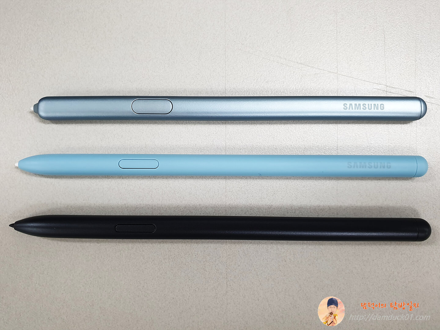 갤럭시 탭 S6, 갤럭시 탭 S6 Lite, 갤럭시 탭 S7의 S펜을 나란히 놓고 살펴보면 길이가 점점 길어지고 갤럭시 탭 S6의 S펜만 납작한 형태, 갤럭시 탭 S6 Lite와 갤럭시 탭 S7의 S펜은 원형에 한쪽만 납작한 디자인을 하고 있어요. 그리고 갤럭시 탭 S6 Lite의 S펜은 블루투스가 없어서 내장 배터리가 없고 갤럭시 탭 S6와 갤럭시 탭 S7의 S펜은 블루투스가 적용되어서 에어 제스처 기능이 가능한 제품이죠.