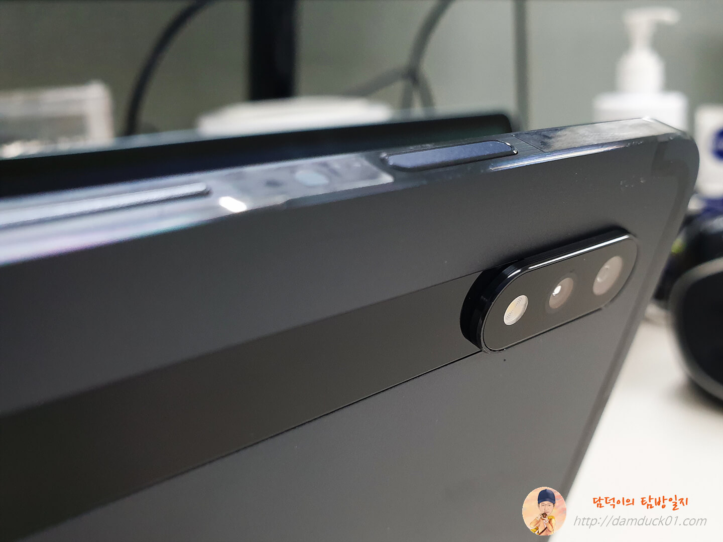 전면 카메라는 특이하게(?) 가로 기준으로 봤을 때 상단 중앙에 자리 잡고 있는데 갤럭시 탭의 주 사용을 기존처럼 세로가 아닌 가로 기준으로 권장하고 있는 듯한 느낌입니다. 저는 전면 카메라가 이 위치에 있는 것도 나쁘지는 않은 거 같아요.