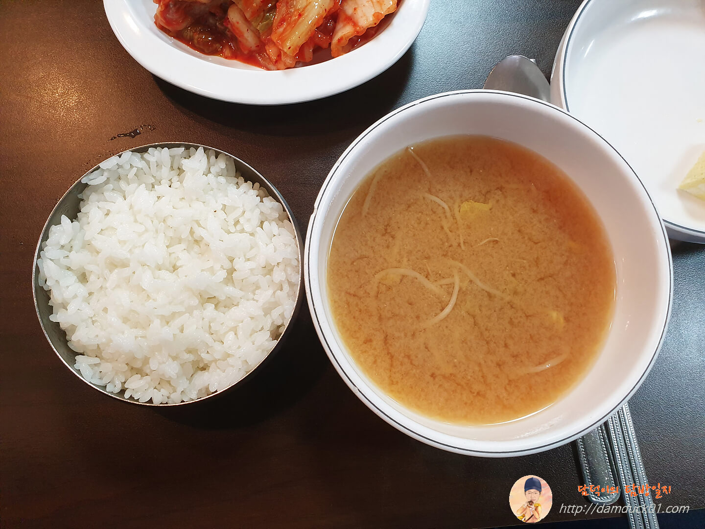 쌈밥 정식을 주문하면 이렇게 공깃밥과 콩나물이 들어 있는 된장국이 나와요.