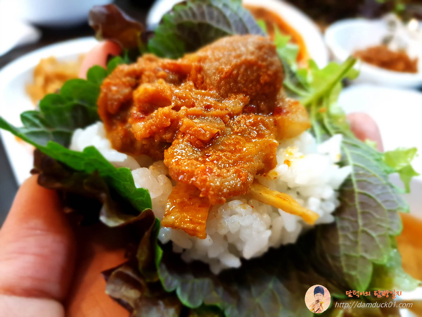 상추, 치커리, 깻잎, 양배추 등 종류도 다양하고 싱싱하고 이 쌈 채소도 너무 맛있어요.
