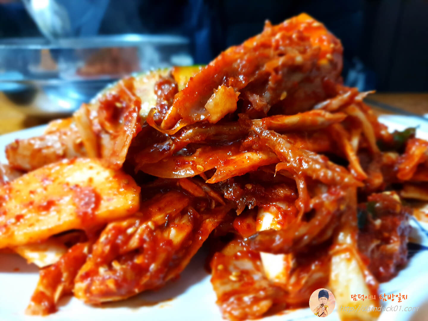 딱 보기에 20,000원이라는 가격에 비해 닭고기가 너무 적은 거 아닌가?라는 생각을 했어요. 하지만 막상 먹어보니 닭고기가 엄청 많네요. 전 저 닭무침에 양배추 같은 채소들이 많을 거라고 생각했는데 채소가 거의 없습니다. 큼직하게 썰은 배, 사과, 오이를 제외하고는 전부 닭고기예요. 쭉쭉 찢은 닭 가슴살을 양념에 무친 진짜 닭무침이라는 이름이 어울리는 음식입니다.