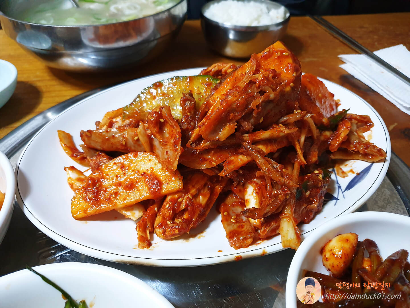 절 여기까지 오게 한 닭무침입니다. 예상한 것과 비슷한 맛일까요? 닭무침이라고 해서 '골뱅이무침처럼 새콤 매콤한 양념에 골뱅이 대신 닭고기를 무친 거겠지?'라는 생각을 하고 왔거든요.