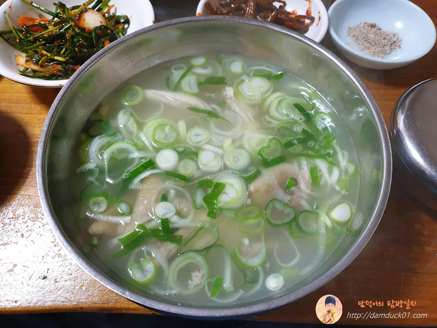 주문한 음식이 다 나왔습니다. 닭곰탕이랑 닭무침인데 진짜 아무런 요리의 기교(?)가 보이지 않는 옛날 느낌의 닭곰탕이네요. 딱 보기에도 양은 엄청 많아요.