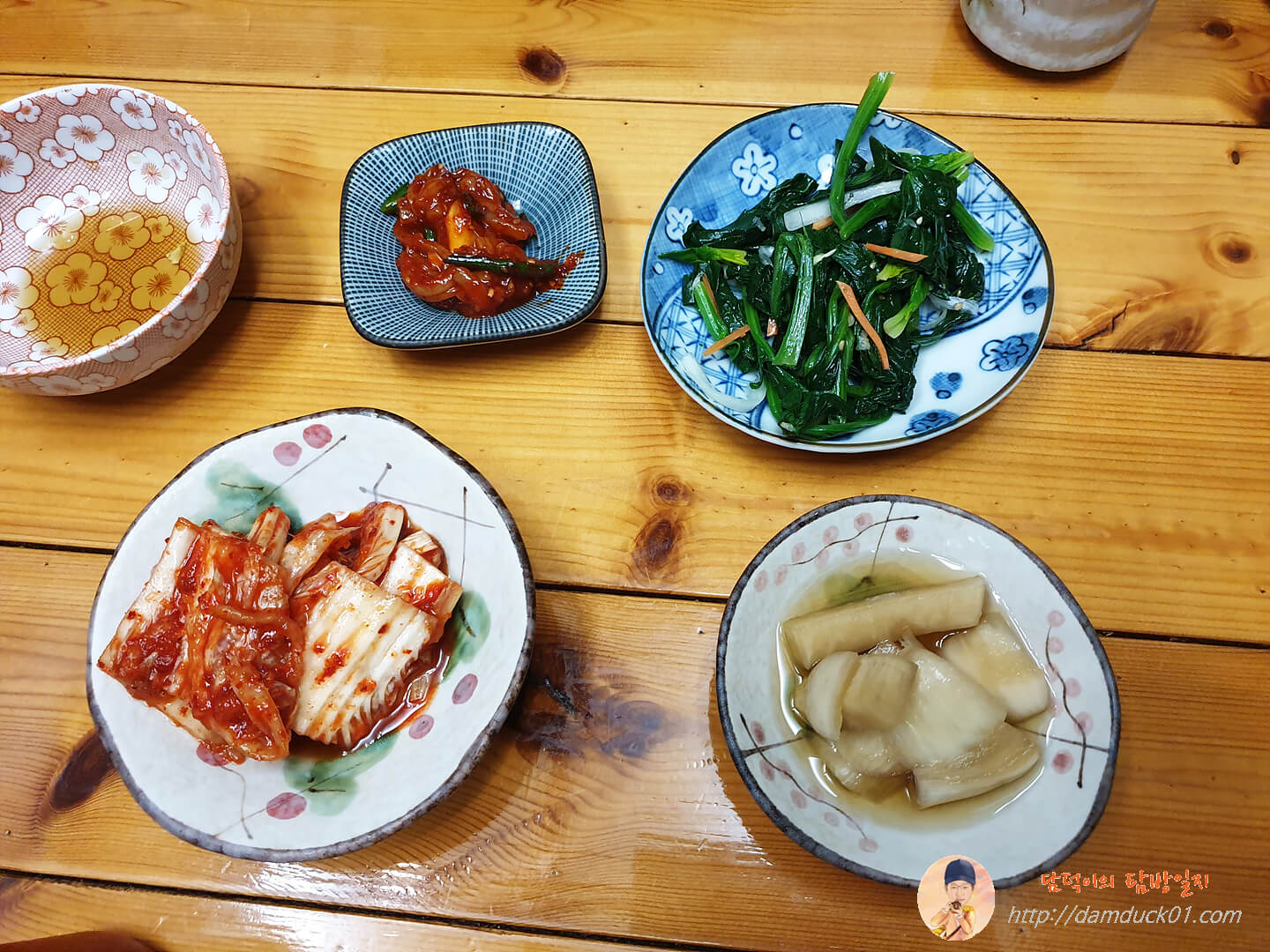 기본 반찬이 준비되었는데 지난번에는 어묵이 어제는 시금치로 바뀌었네요.