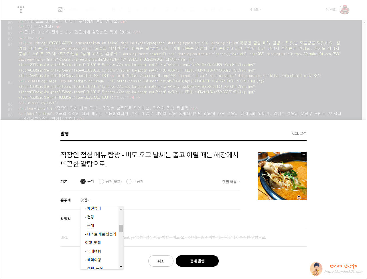 언제부터 이 홈 주제(채널명)가 생긴 건지 모르겠는데 전 오늘 발견했네요. 새벽에 일어나서 오늘 발행할 포스팅을 하고 발행을 하려고 하는데 응? 홈 주제에 "- 테스트 새로 만든 거"라는 주제가 딱!