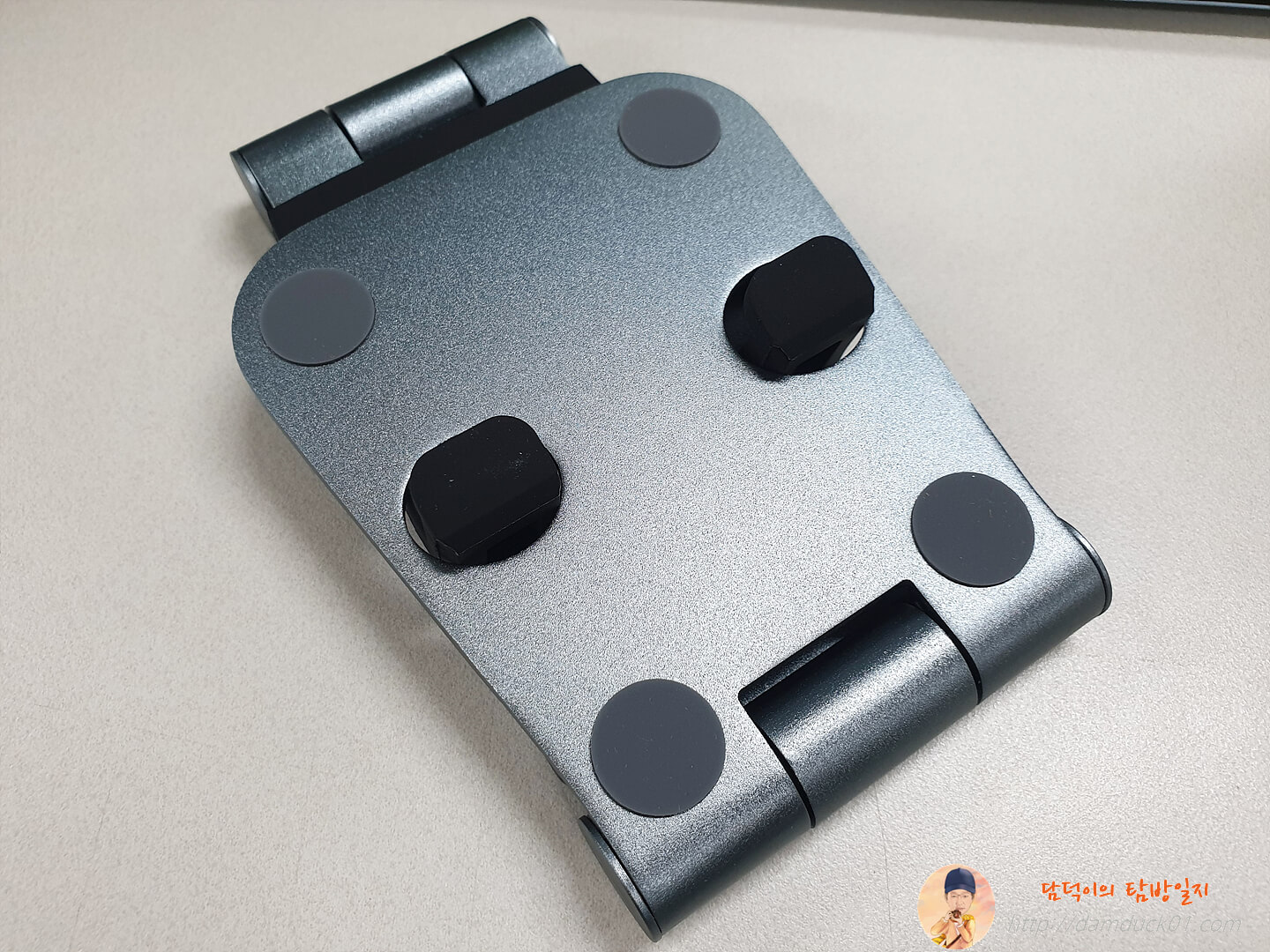 위시비 bstand 역시 하단에 미끄럼 방지 패드가 4군데 적용되어 있어요. 그런데 특이한 건 중앙에 두 개의 큰 구멍이 뚫려 있고 그 구멍으로 거치대의 고정 부분이 들어와 있습니다. 유사한 다른 거치대에 비해 거치 제품을 잡아주는 부분이 큰 고무(제품 안내에 의하면 실리콘) 홀더로 적용되어 있는데 크기가 크고 두껍다 보니 접었을 때 깔끔하게 접히도록 하기 위해 구멍을 뚫고 그 구멍으로 저렇게 나오게 해서 접을 수 있도록 디자인한 거 같아요. 제가 사용 중인 제품 역시 같은 이유로 구멍이 뚫려 있긴 한데 저렇게 꽉 차게 되어 있지는 않아서 이 부분이 인상적이네요.