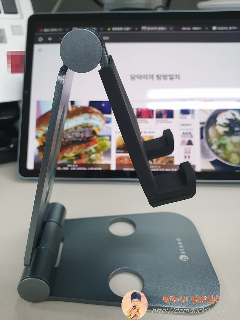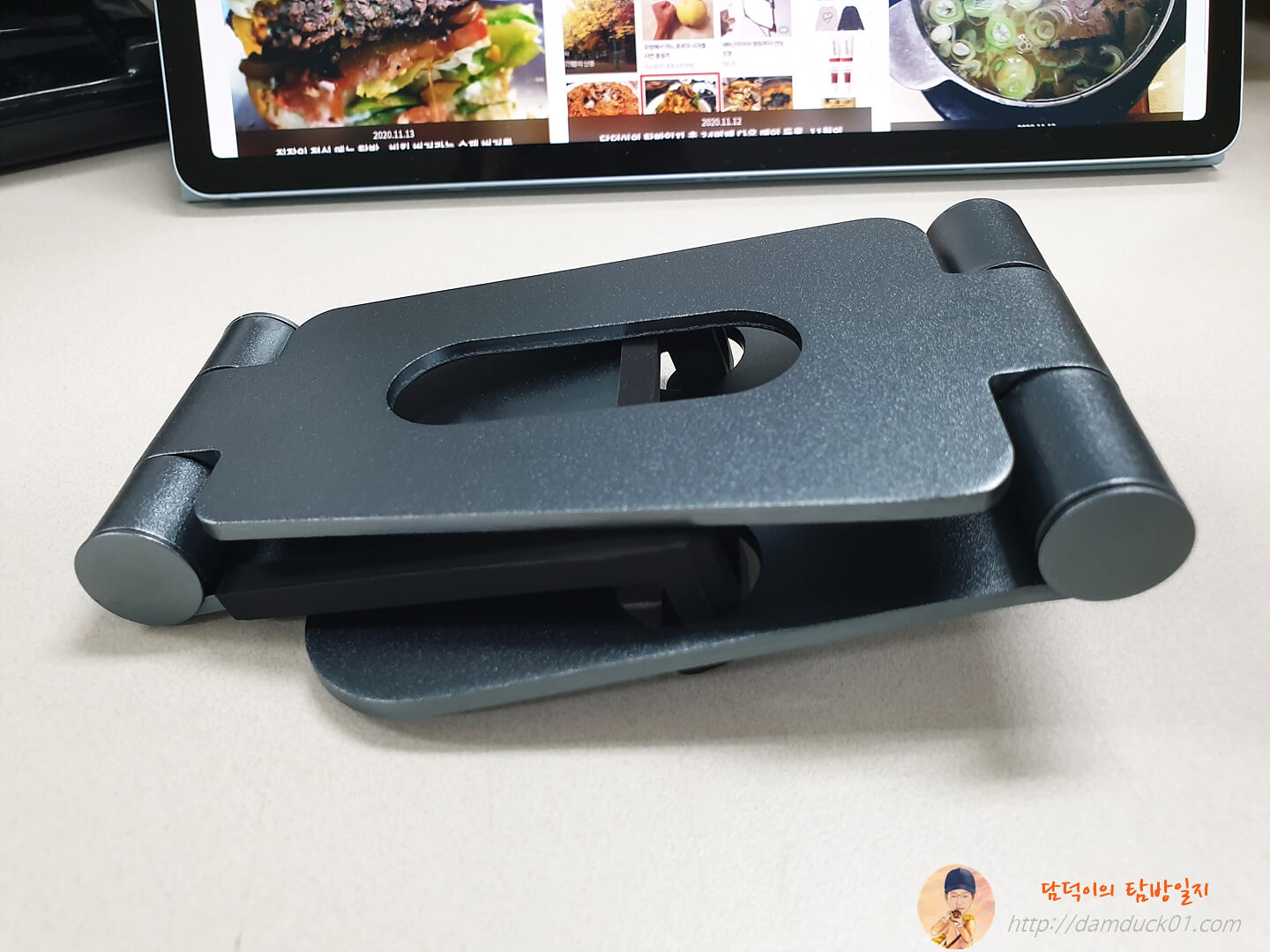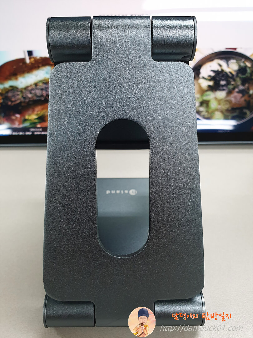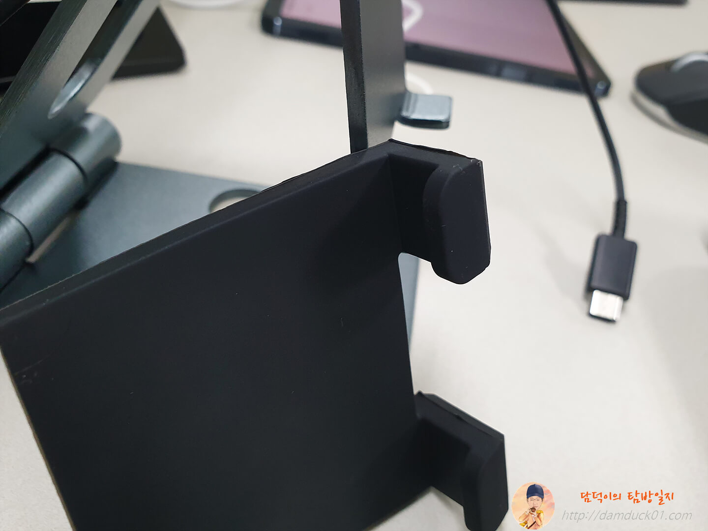 깔끔하게 접힌 채로 되어 있네요. 제가 디자인에 대해 잘 몰라서 그런 거겠지만 디자인은 큰 차이를 모르겠어요. 이런 거치대는 디자인에서 차별화를 가지지는 못하는 거 같아요. 소재와 본체의 어디에 구멍을 어떻게 뚫어서 선 정리를 도와줄 것인가? 어디에 고무를 배치해서 미끌림 방지를 시킬 것인가 하는 기능적 디자인이 살짝 다른 정도?