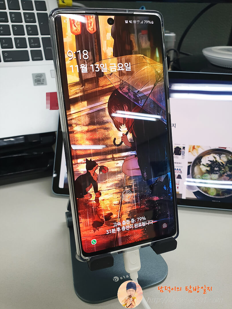 이건 개봉기를 하기 위해서 거치 후 충전기를 연결한 모습인데 이렇게 스마트폰을 거치하고 뒤쪽 구멍을 통하지 않고 충전 케이블을 연결하면 선이 좀 지저분해 보일 수 있는 거죠.