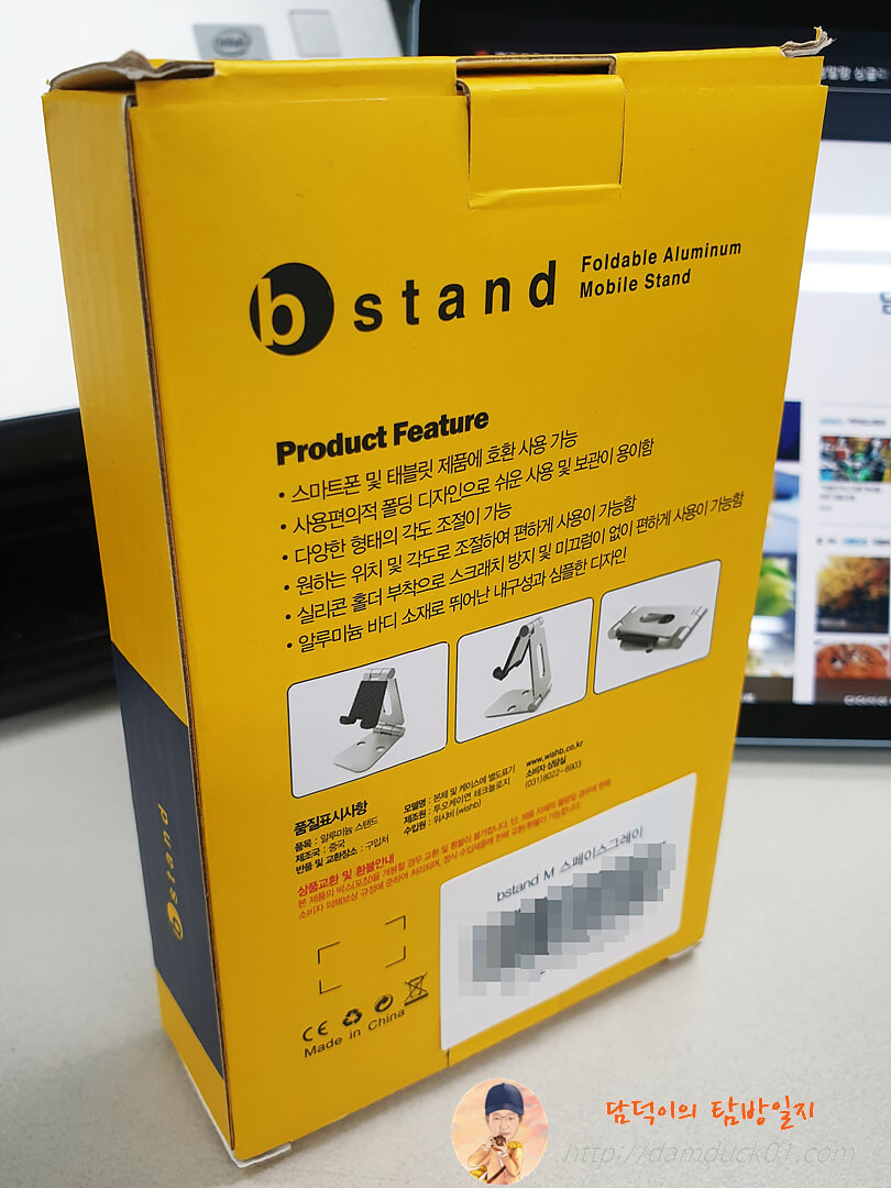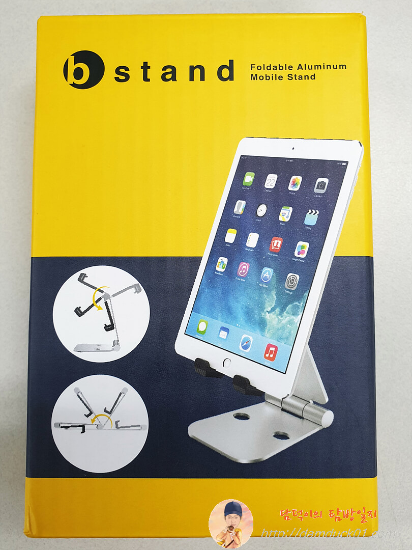 노란색이 포인트 컬러인 거 같아요. 상단에 bstand Foldable Aluminum Mobile Stand라고 인쇄가 되어 있고 중앙에는 거치대의 회전 반경을 표시한 이미지와 아이패드를 거치한 사진이 인쇄되어 있습니다. 사용한 아이패드 이미지를 보니까 출시된 지 꽤 오래된 제품인 거 같네요. 요즘 출시되는 아이패드들은 하단에 저 홈 버튼이 없어졌죠? 이런 디자인의 거치대 제품들은 꽤 다양한 업체에서 출시가 되어 있죠. 저도 하나 가지고 있는데