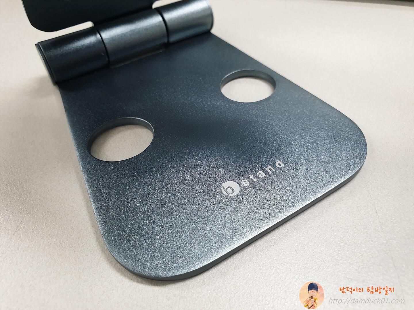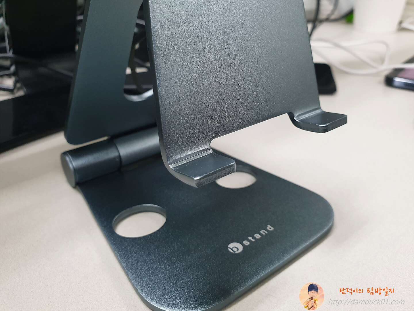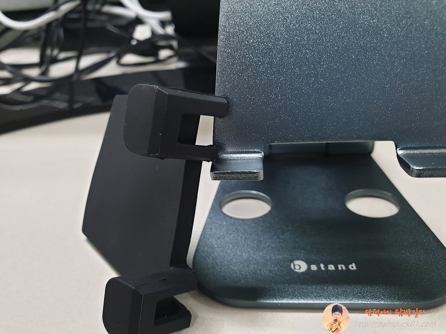 위시비 bstand 역시 하단에 미끄럼 방지 패드가 4군데 적용되어 있어요. 그런데 특이한 건 중앙에 두 개의 큰 구멍이 뚫려 있고 그 구멍으로 거치대의 고정 부분이 들어와 있습니다. 유사한 다른 거치대에 비해 거치 제품을 잡아주는 부분이 큰 고무(제품 안내에 의하면 실리콘) 홀더로 적용되어 있는데 크기가 크고 두껍다 보니 접었을 때 깔끔하게 접히도록 하기 위해 구멍을 뚫고 그 구멍으로 저렇게 나오게 해서 접을 수 있도록 디자인한 거 같아요. 제가 사용 중인 제품 역시 같은 이유로 구멍이 뚫려 있긴 한데 저렇게 꽉 차게 되어 있지는 않아서 이 부분이 인상적이네요.