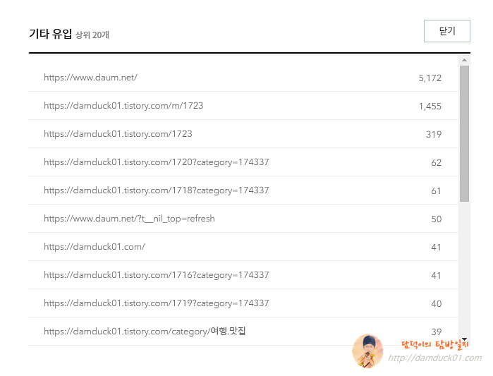유입 로그를 확인해 보니 다음 모바일의 유입보다는 다음 PC 유입이 압도적입니다. 모바일에서는 노출이 잘 안 되나 봐요. 모바일 노출의 기준이 뭔지 점점 궁금해지는데 알 수가 없습니다. 😓