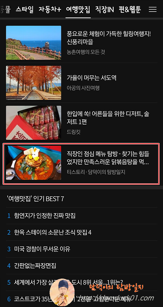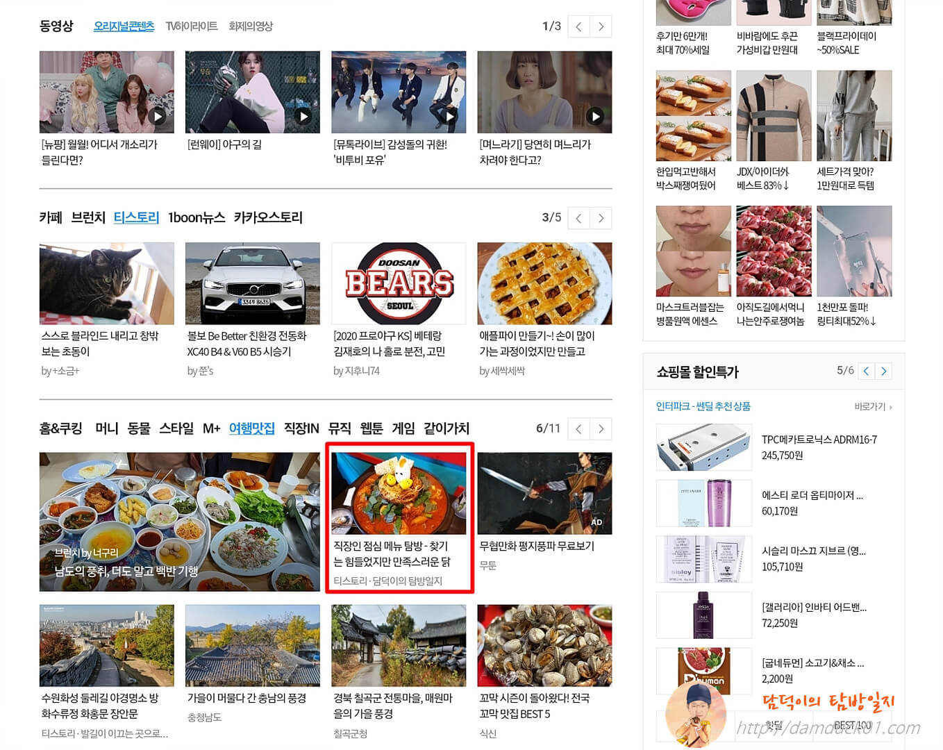 직장인 점심 메뉴 탐방 글인 만큼 당연하게 여행맛집 채널에도 등록이 됐고 이렇게 다음 PC 사이트의 여행맛집 채널에도 제 글이 보이는 걸 확인할 수 있었습니다.