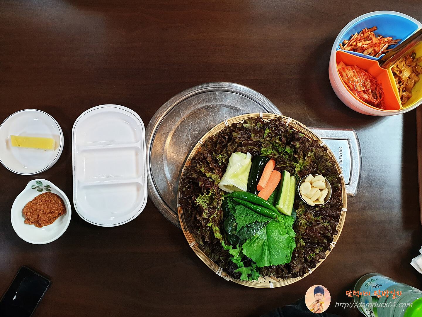 부드러운 식감의 달걀찜 한 조각과 쌈장, 다양하고 신선한 쌈채소와 독특한 3가지 반찬통이 집게와 함께 손님들을 기다리고 있어요.