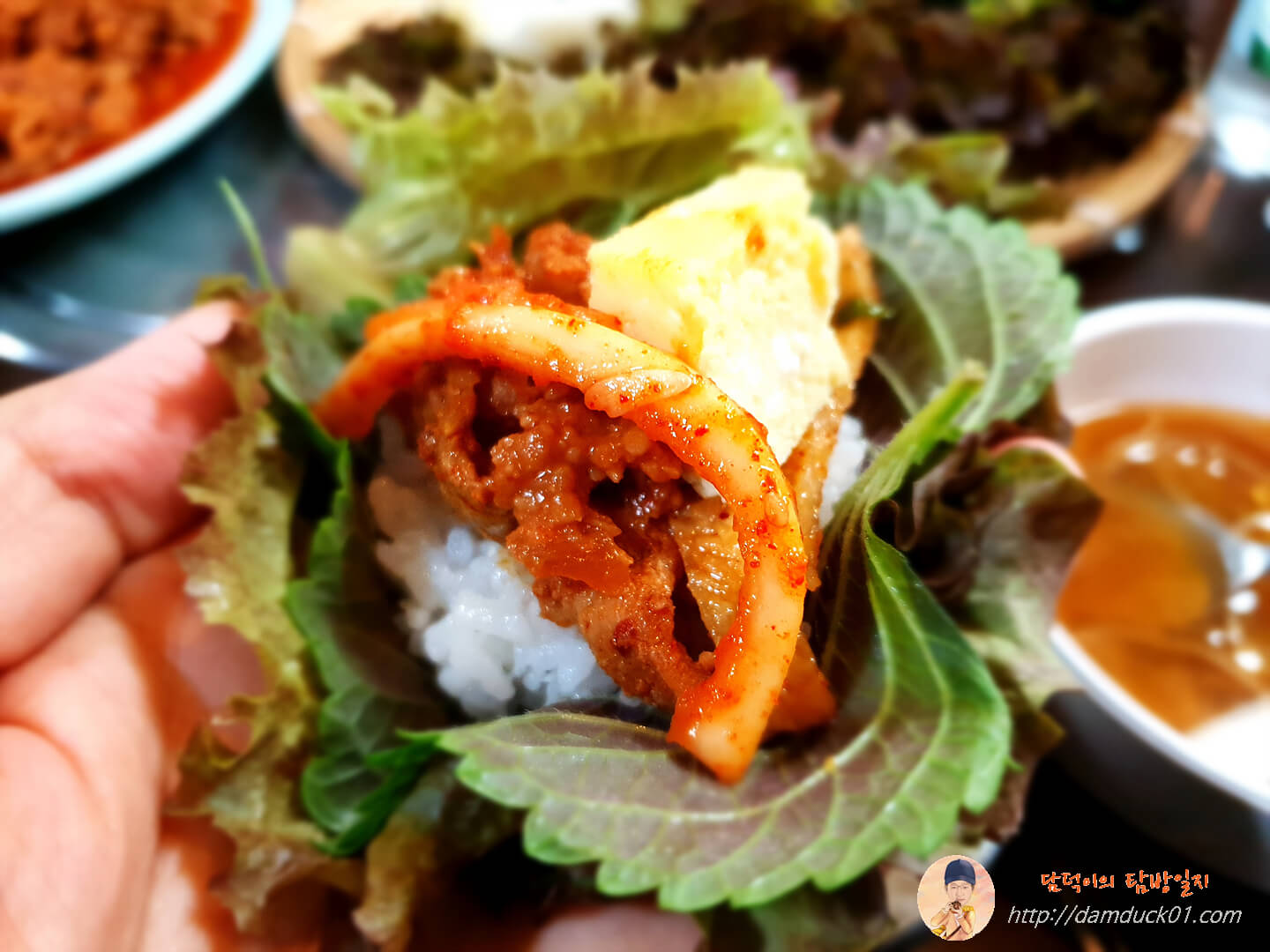 최소 두 가지 이상 쌈채소에 밥 얹고 제육 얹고 취향에 맞게 반찬들까지 얹은 후 마지막으로 쌈장 살짝 올려서 먹으면
