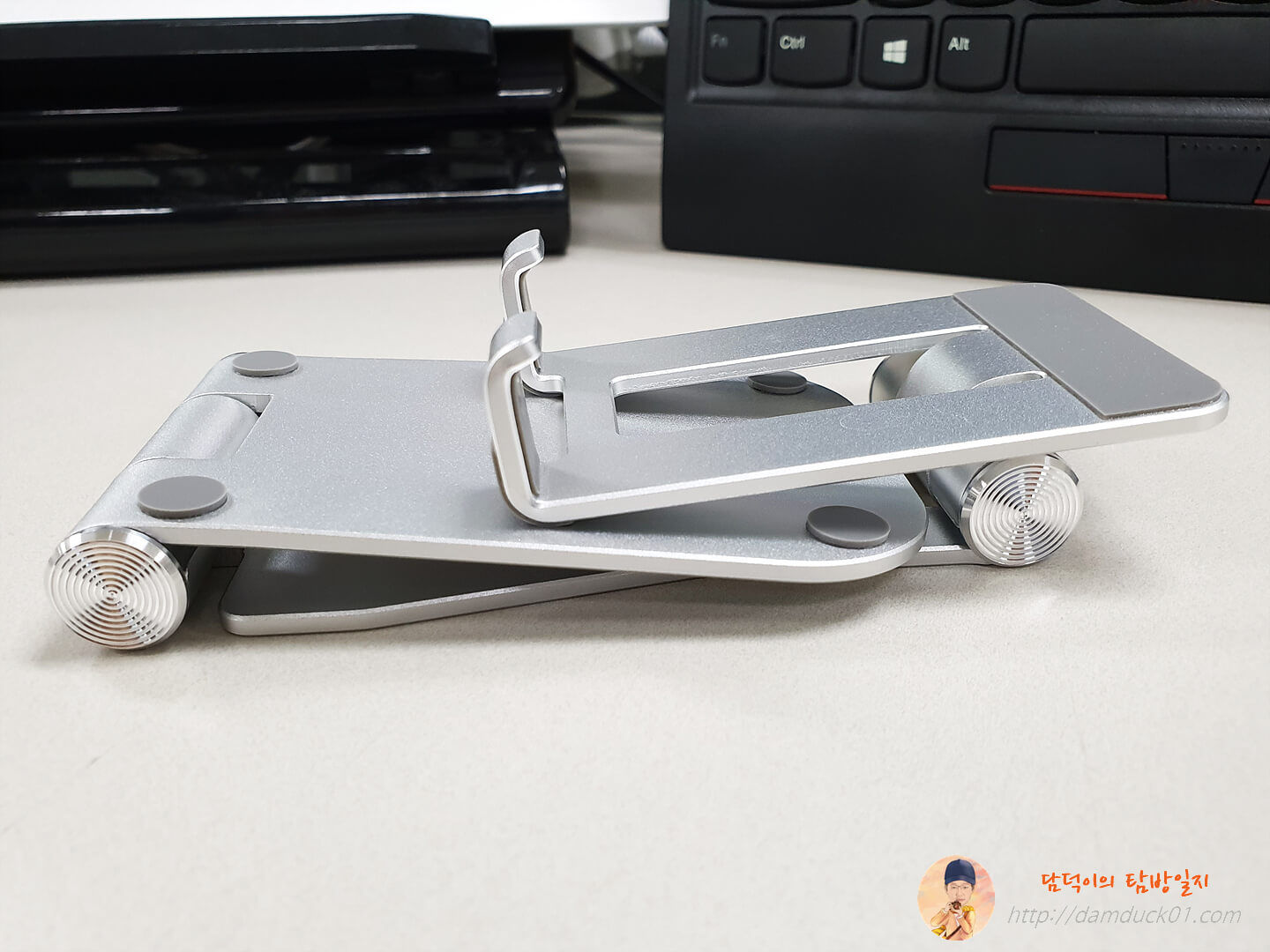 그런데 와이즈데이 휴대용 접이식 탁상용 핸드폰 거치대 포터블 S+가 되면서 추가된 실리콘으로 인해 이런 식으로도 거치가 가능해지게 됩니다. 굳이 실리콘이 없어도 이렇게 사용하려면 사용은 할 수 있지만 저 부분에 추가가 되면서 태블릿을 거치하고 터치나 펜 작업을 할 때 미끄럼 방지와 책상의 긁힘이 방지되는 효과가 있게 되었어요.
