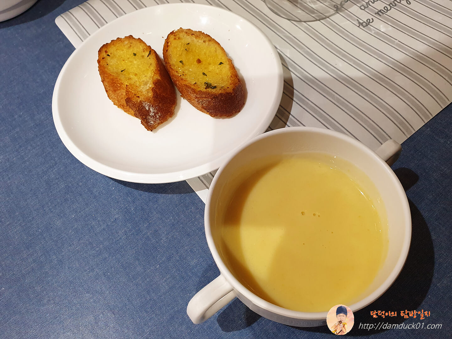 모닝빵에서 마늘 바게트로 바뀌고 수프는 뭔가 들어 있던 수프에서 단출한 옥수수 수프로 바뀌었네요.