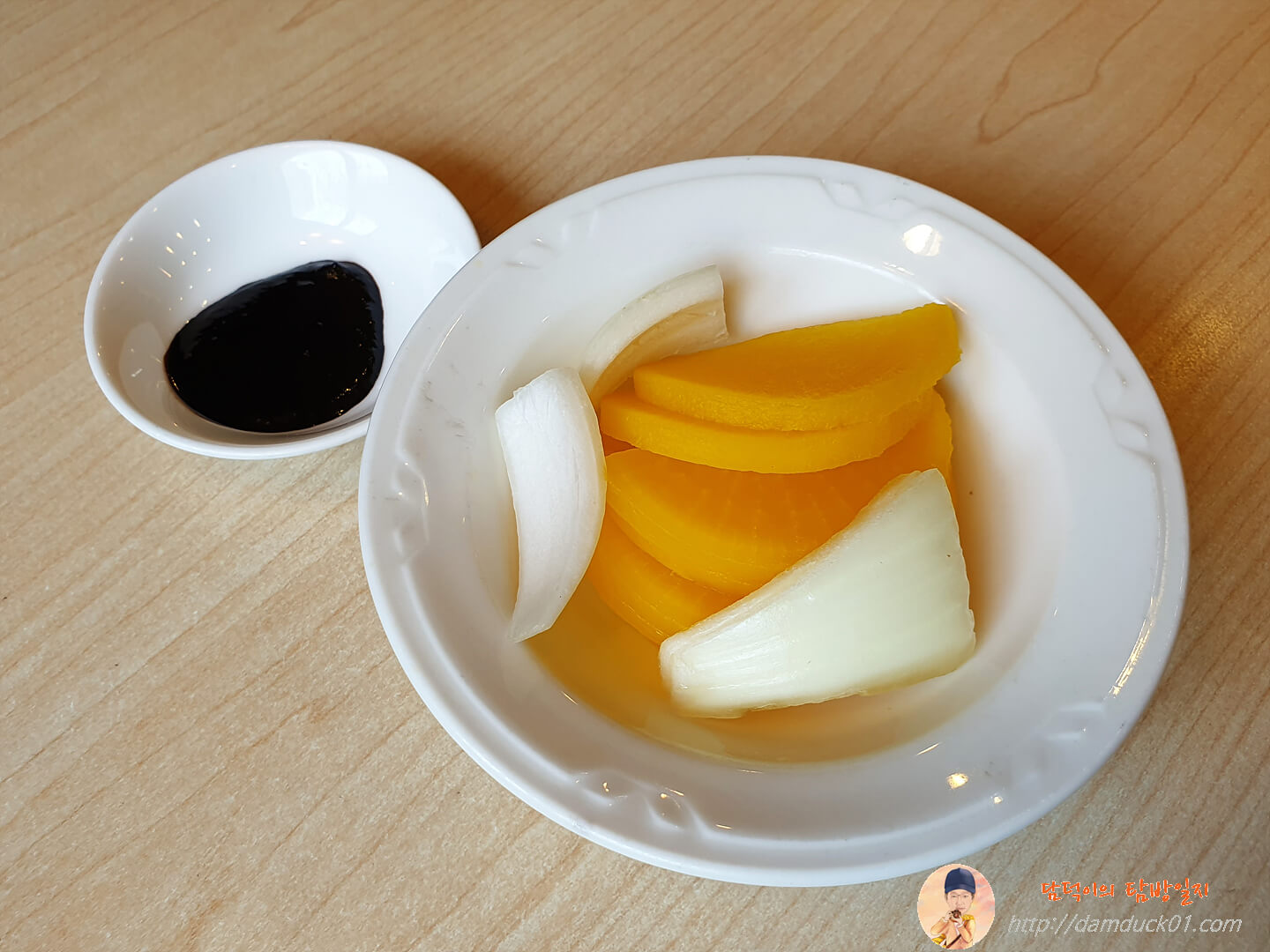 단무지랑 양파가 한 접시에 그리고 작은 춘장 한 접시.