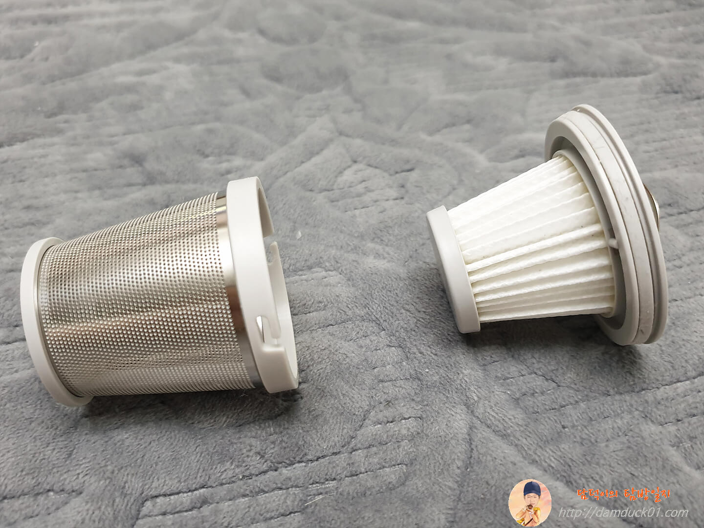 여기를 살짝 돌려주면 이렇게 분리가 가능합니다. 여과망과 헤파 필터 이중 구조로 되어 있는데 이 헤파 필터도 물청소가 가능하다고 하는데 청소 후는 완전히 말려서 사용을 해야 할 거 같아요. 그리고 헤파 필터는 소모품으로 별도 구매가 가능한데 정식 출시가 안 된 제품이라 필터도 직구로 구매를 해야 할 거 같아요. 한 번 알아보니까 9,000원대로 구매가 가능하다고 합니다.