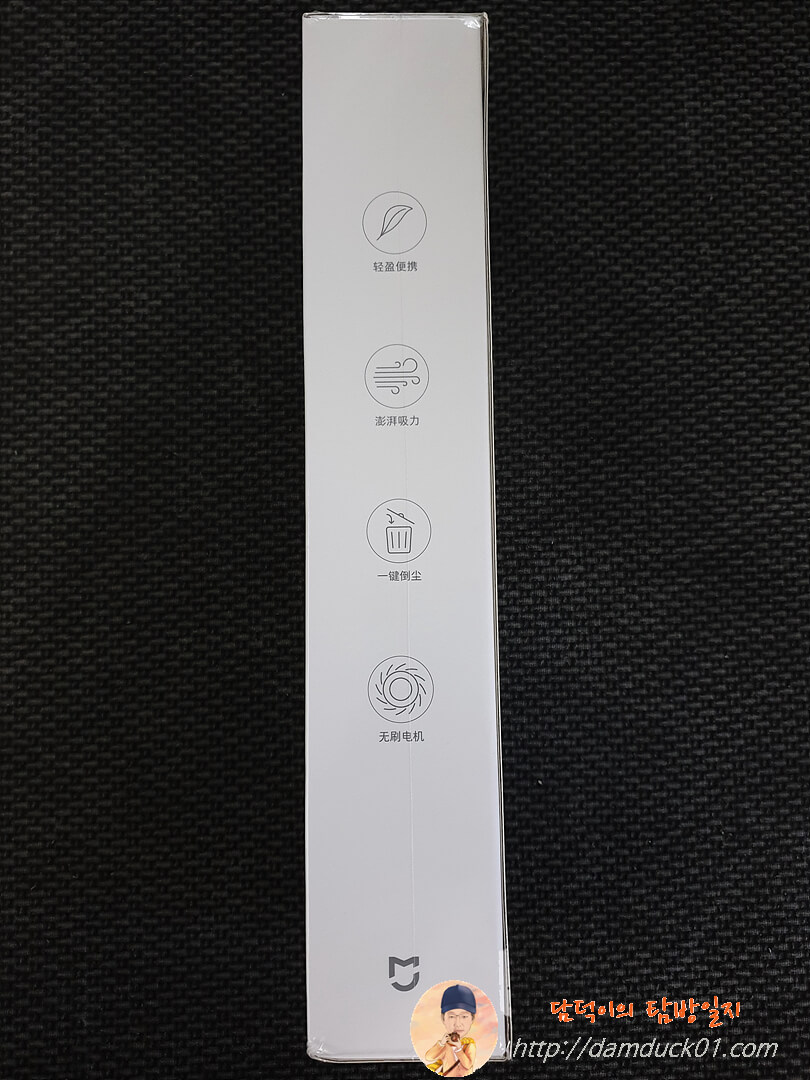 너무 고가의 제품은 A/S가 불가능한 제품 같은 경우 부담이 있는데 샤오미 미지아 차량용 핸디 무선 청소기는 3만 원대 가격에 구매가 가능합니다. 초기 불량만 아니라면 딱히 고장인 날 제품은 아니고 1년이나 2년 사용하다 문제가 생길만한 건 배터리인데 배터리 교환비용이나 새로 구매 비용이나 비슷할 거 같아서 이런 제품은 가격만 맞으면 그냥 해외 제품을 구매하기도 합니다. 상자 측면에는 제품의 특징이 아이콘과 함께 한자로 표시가 되어 있는데 양쪽 다 동일한 아이콘이네요. 한자는 뭐라고 쓰여 있는지 번역이 불가능했어요.