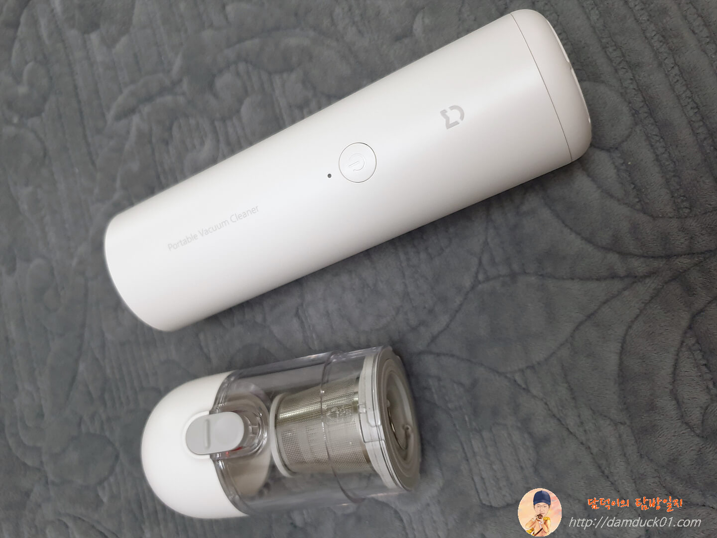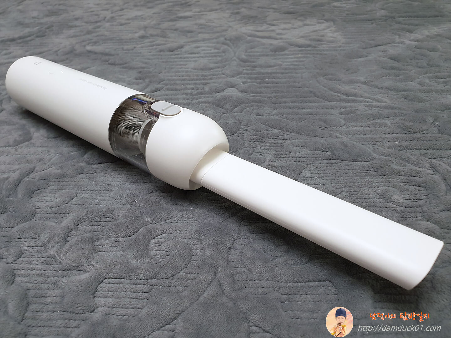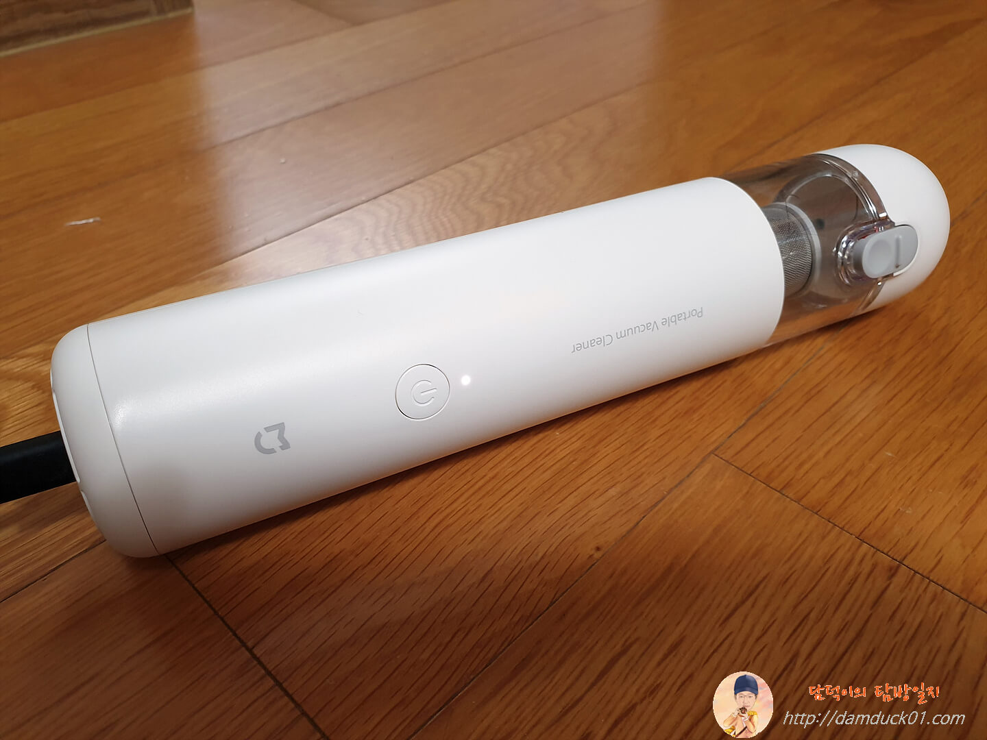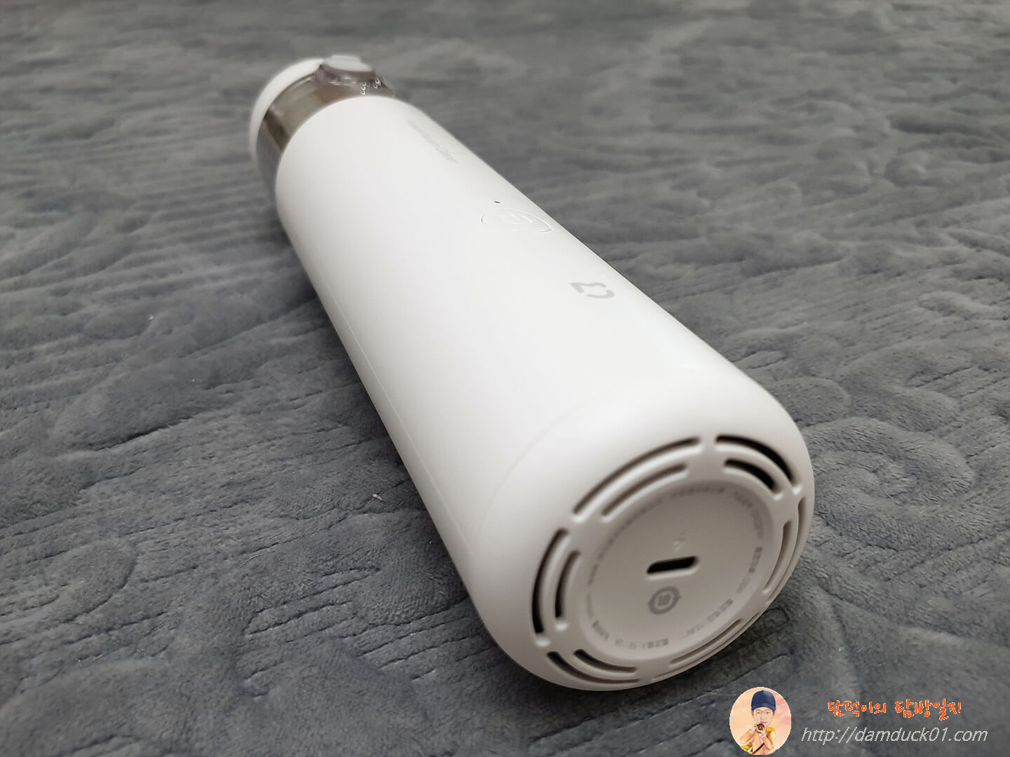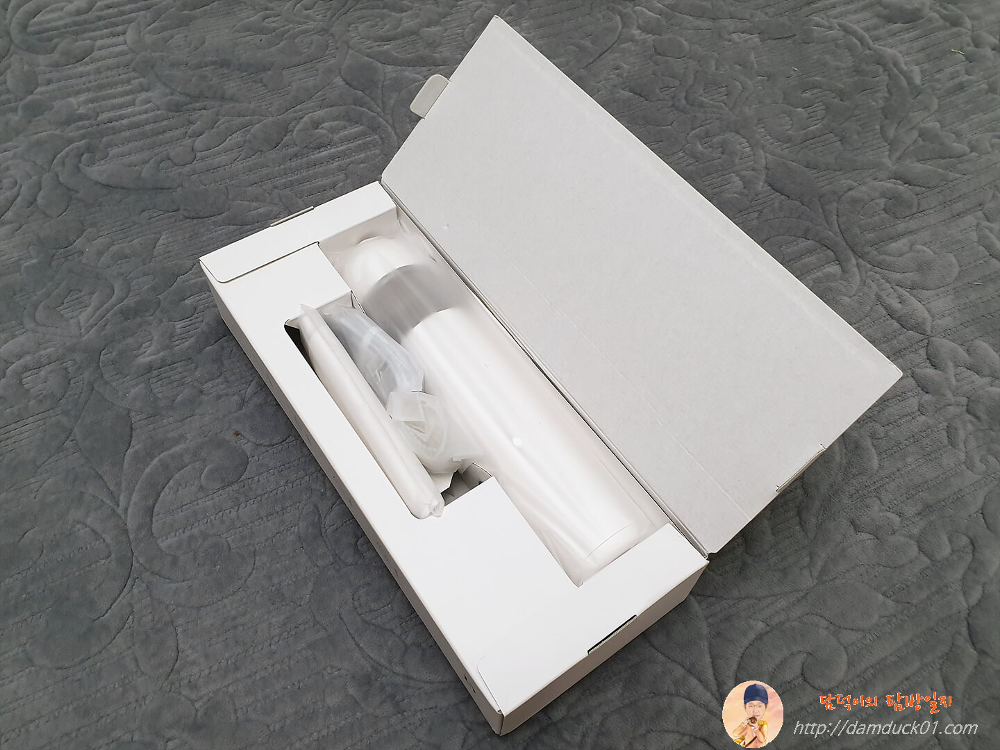설명서 없이 그냥 직접 알아봐야겠습니다. 샤오미 미지아 차량용 핸디 무선 청소기는 흰색의 이쁜 텀블러 디자인을 하고 있어요. 스펙상 무게는 약 0.5kg이라는데 보는 것에 비하면 꽤 무거워요. 아무래도 배터리 때문인 거 같은데 크기는 작아 보이는데 들어보면 순간 놀랄 정도로 무게감이 있네요.
