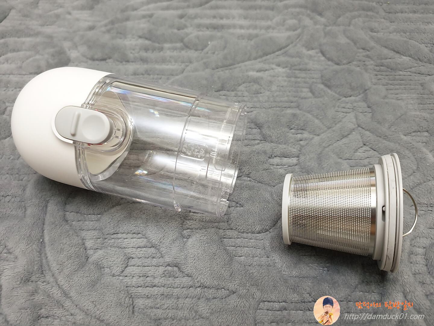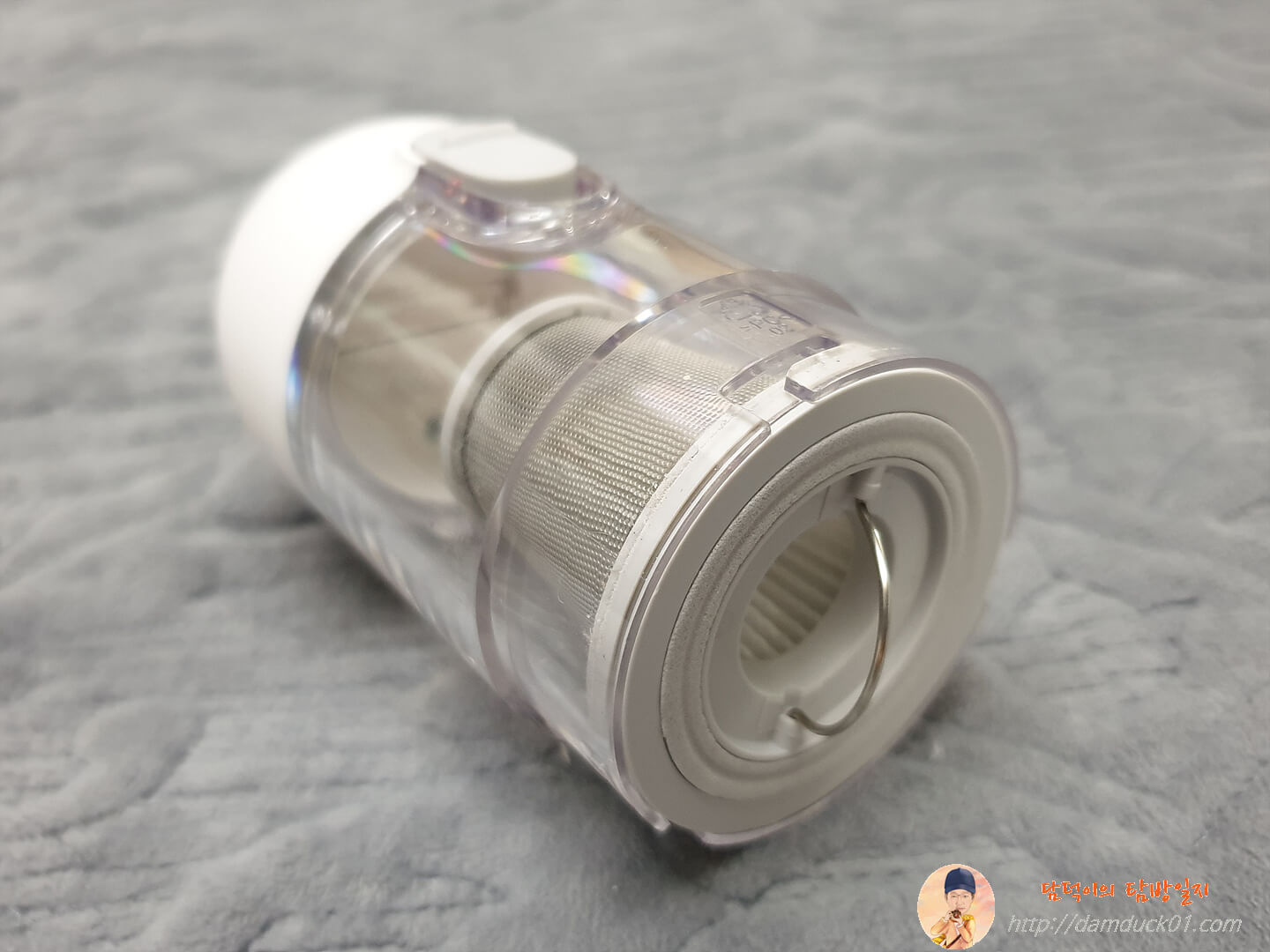 여기를 살짝 돌려주면 이렇게 분리가 가능합니다. 여과망과 헤파 필터 이중 구조로 되어 있는데 이 헤파 필터도 물청소가 가능하다고 하는데 청소 후는 완전히 말려서 사용을 해야 할 거 같아요. 그리고 헤파 필터는 소모품으로 별도 구매가 가능한데 정식 출시가 안 된 제품이라 필터도 직구로 구매를 해야 할 거 같아요. 한 번 알아보니까 9,000원대로 구매가 가능하다고 합니다.