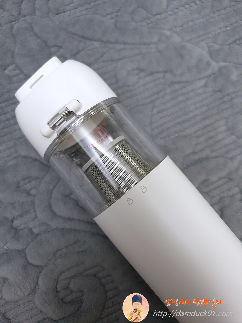상단에 투명한 플라스틱 부분이 바로 먼지통인데 크기가 상당히 작아요. 다른 리뷰들을 찾아보면 이 작은 먼지통이 유일한 불만이라고 하는 거 같더라고요. 이 먼지통은 뒷면에 아이콘으로 표시가 되어 있는데 위 사진이 잠겨 있는 상태고 우측으로 돌려주면 먼지통 분리가 됩니다.