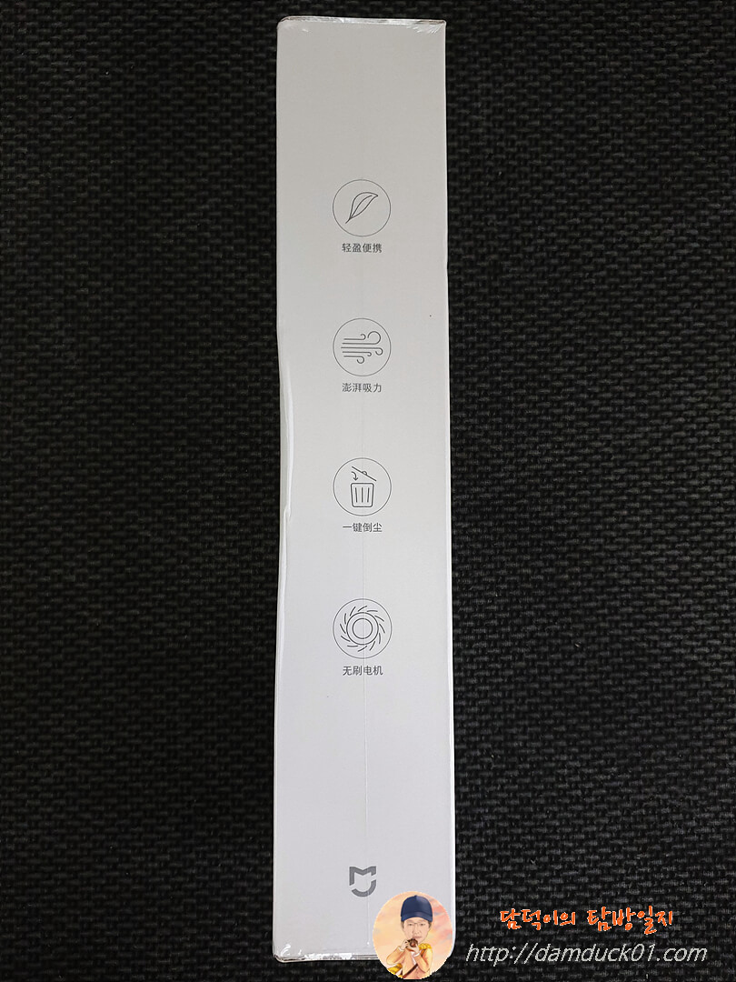 너무 고가의 제품은 A/S가 불가능한 제품 같은 경우 부담이 있는데 샤오미 미지아 차량용 핸디 무선 청소기는 3만 원대 가격에 구매가 가능합니다. 초기 불량만 아니라면 딱히 고장인 날 제품은 아니고 1년이나 2년 사용하다 문제가 생길만한 건 배터리인데 배터리 교환비용이나 새로 구매 비용이나 비슷할 거 같아서 이런 제품은 가격만 맞으면 그냥 해외 제품을 구매하기도 합니다. 상자 측면에는 제품의 특징이 아이콘과 함께 한자로 표시가 되어 있는데 양쪽 다 동일한 아이콘이네요. 한자는 뭐라고 쓰여 있는지 번역이 불가능했어요.