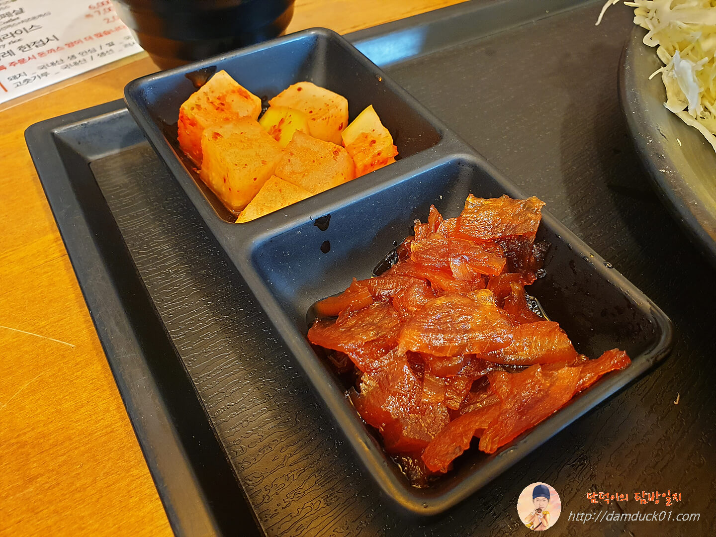별도의 반찬 접시에는 깍두기와 무장아찌가 담겨 있습니다.