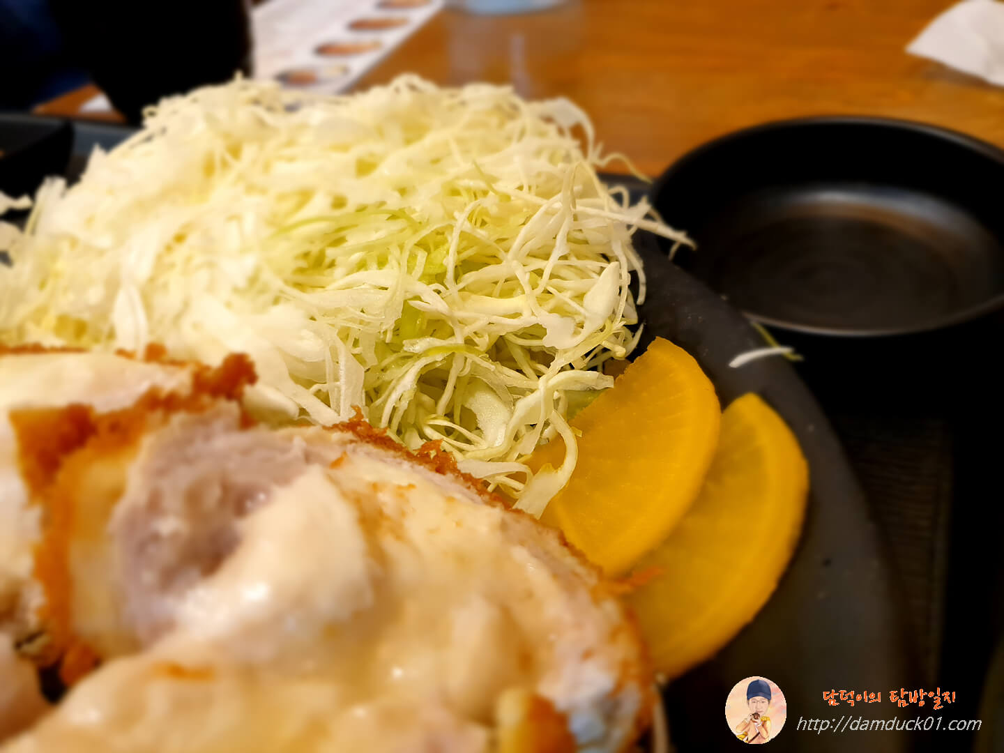 돈가스 뒤쪽에는 푸짐한 채 썬 양배추와 그 사이 수줍은 듯 조용히 가리어진 단무지 두 조각이 보이고요.