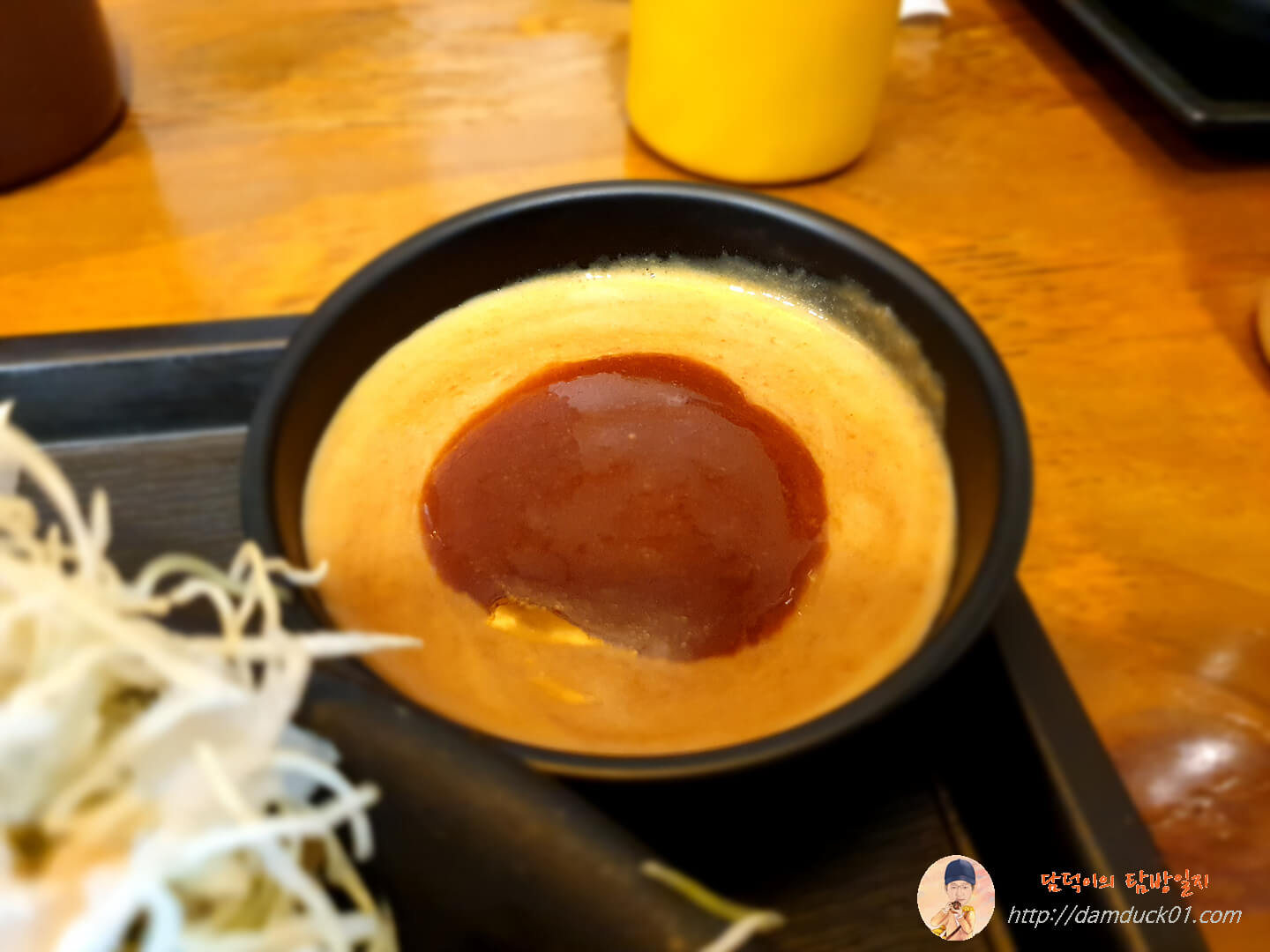 소스 그릇에 돈가스 소스를 뿌리고 와사비 소스 뿌려서 쉐킷 쉐킷 더 맛있게 만들어 줍니다.
