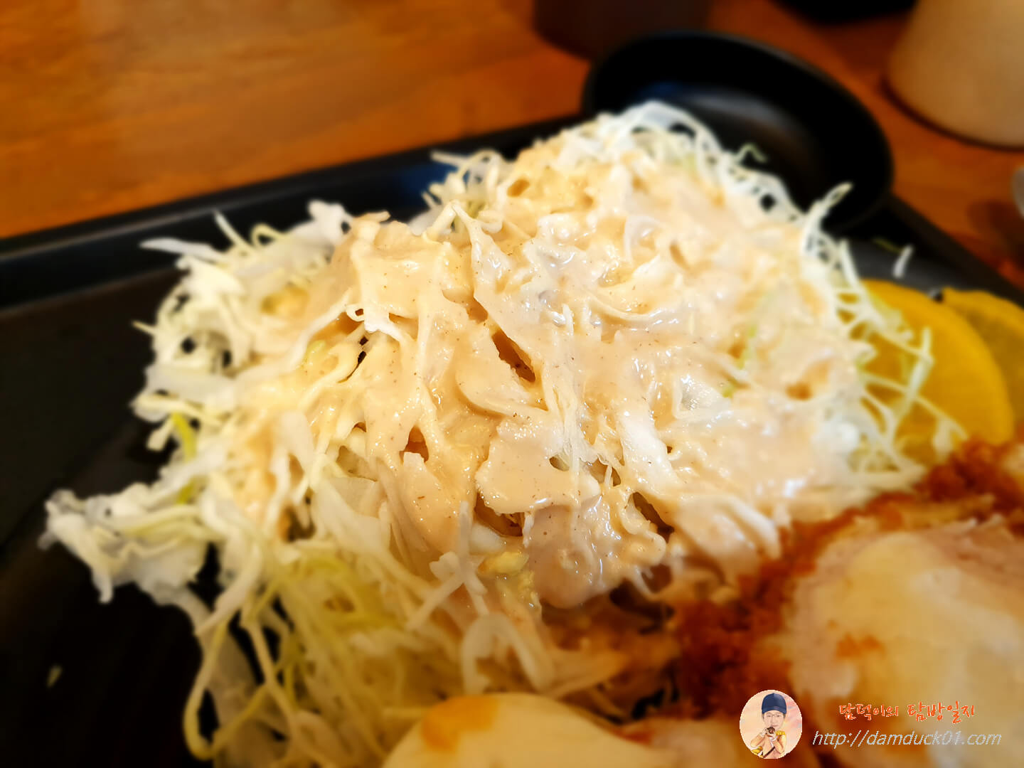 돈가스 뒤쪽에는 푸짐한 채 썬 양배추와 그 사이 수줍은 듯 조용히 가리어진 단무지 두 조각이 보이고요.