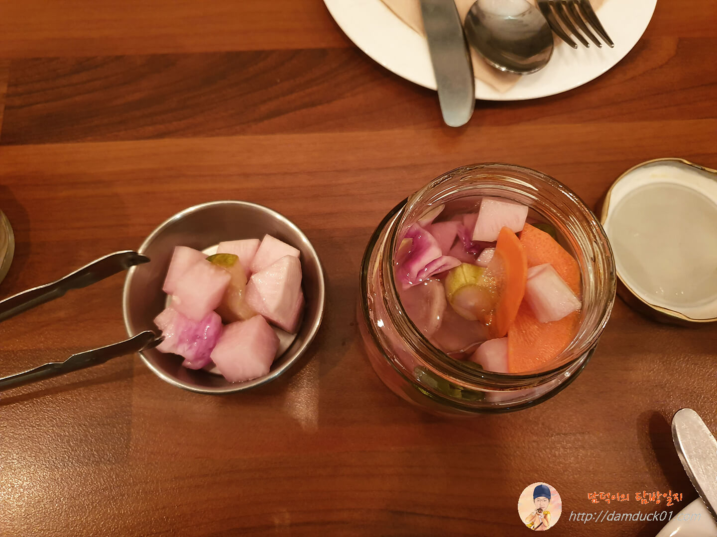 음식을 주문하고 나서 도착한 기본 반찬인 피클.