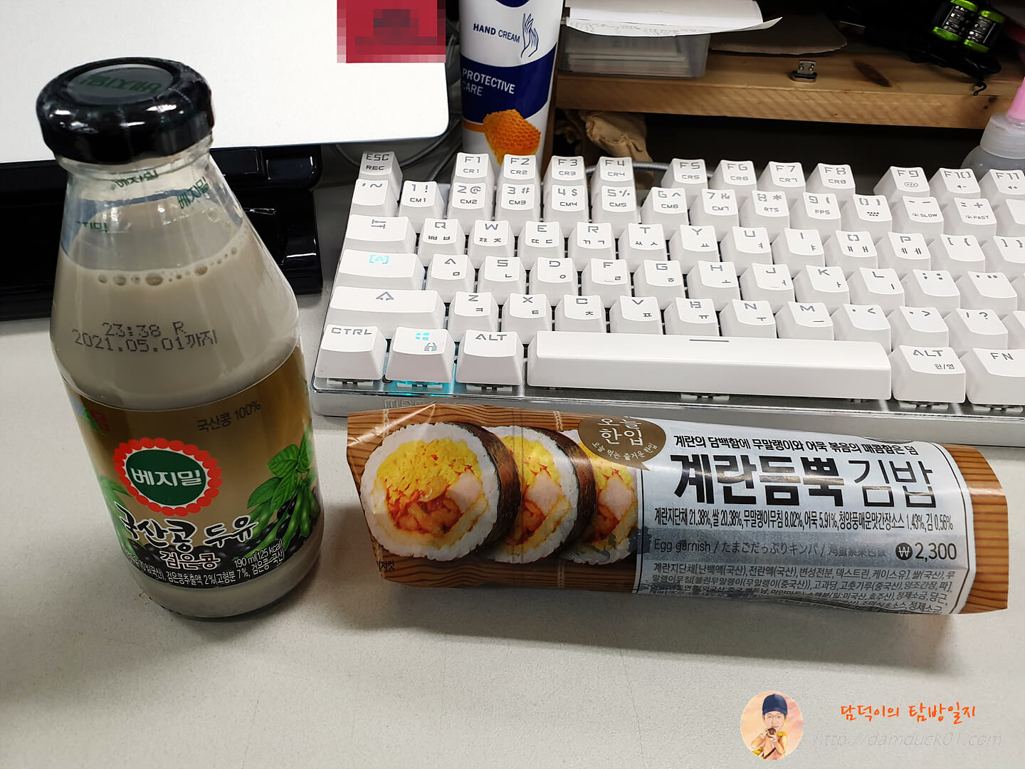 그래서 사온 따뜻하게 데워진 베지밀 국산콩 두유와 계란 듬뿍 김밥입니다.