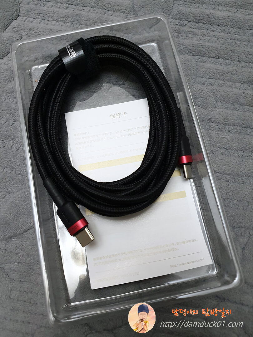 기본 구성품으로 제공되는 Type-C에서 Type-C로 가는 케이블 역시 100W를 지원하는 케이블입니다. 깔끔하게 Baseus가 인쇄된 정리용 벨크로까지 있는 케이블이네요.
