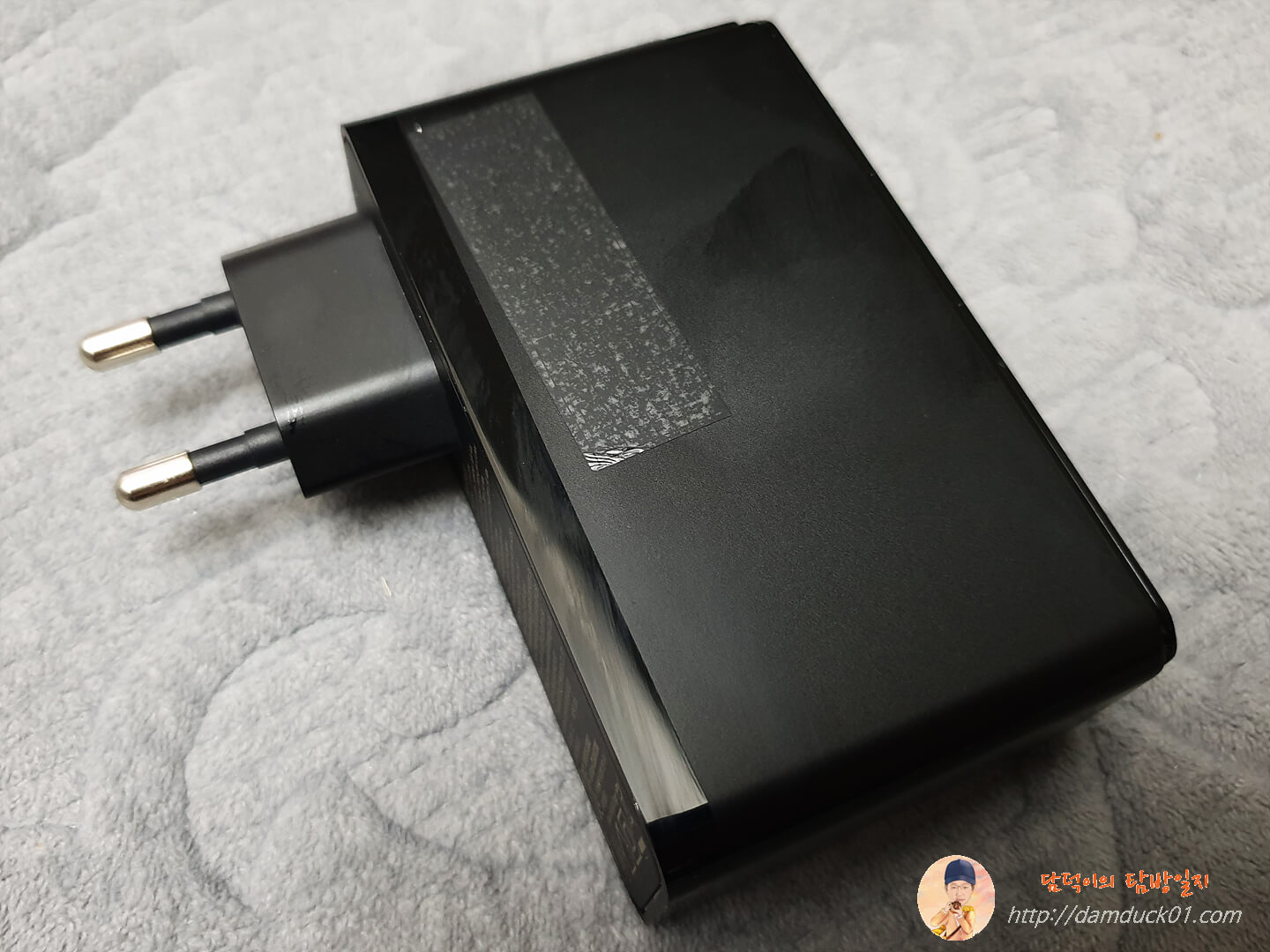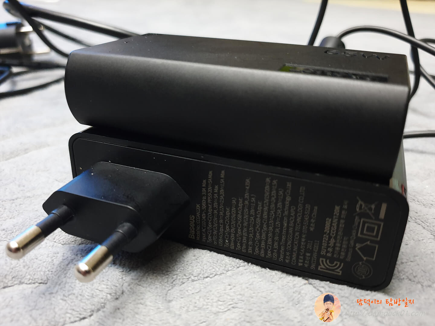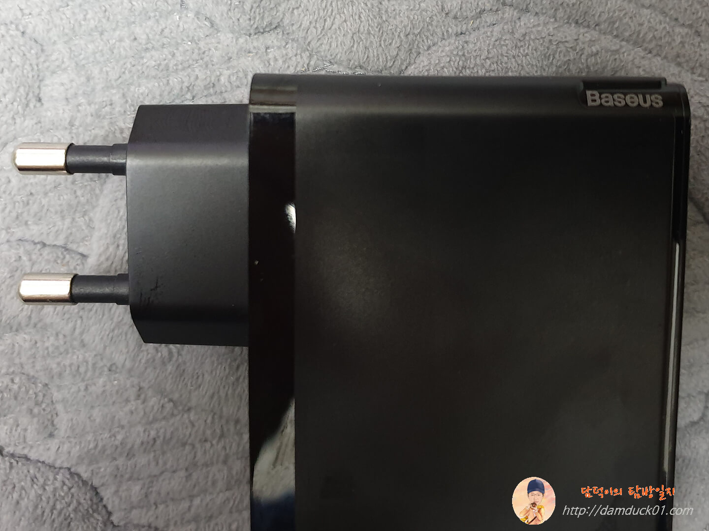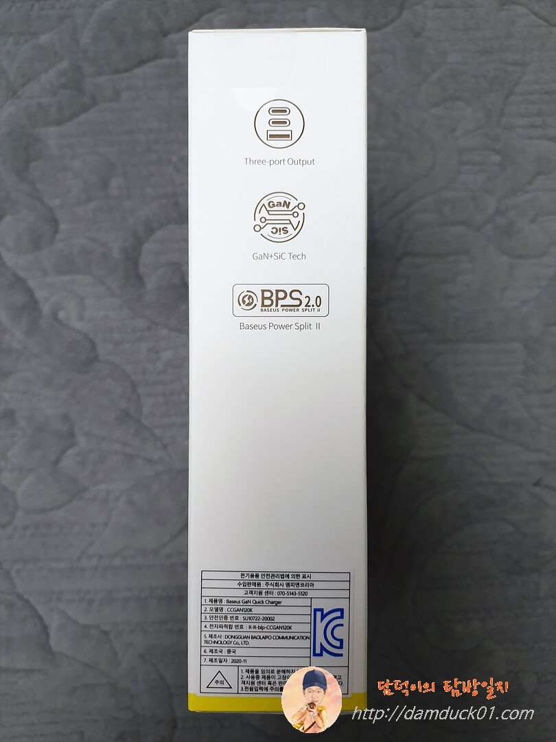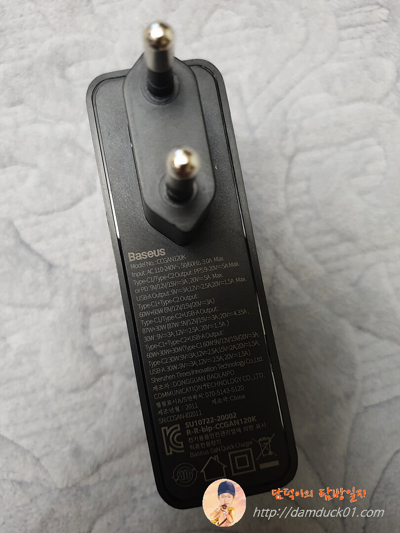 그럼 다시 베이스어스 GaN2 Pro 120W 고속 PD 멀티 충전기를 살펴보면 이렇게 상단에 Baesus가 별도의 공간에 인쇄가 되어 있고요. 국내 정식 출시된 만큼 한국형 플러그가 제대로 적용되어 있습니다.