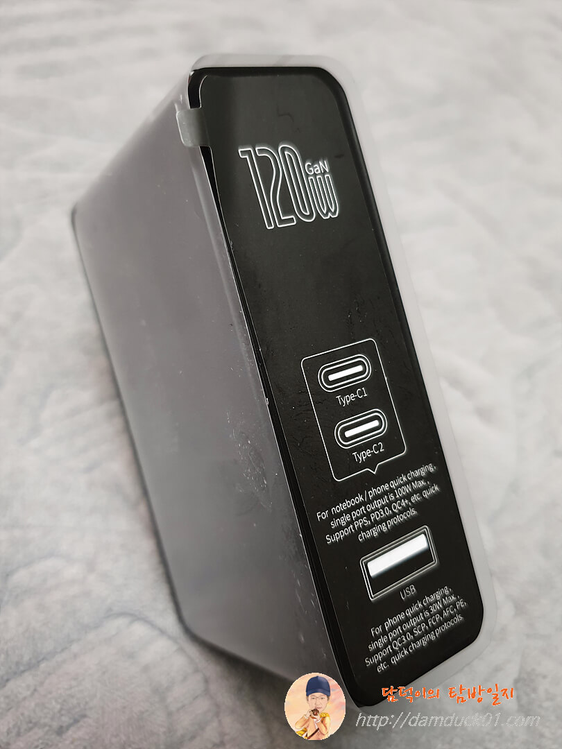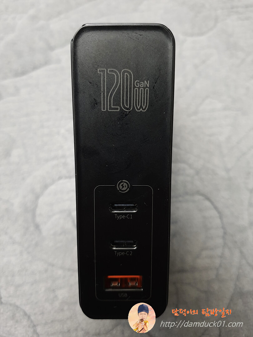 상단에는 120W GaN이라고 인쇄가 되어 있고 하단에 Type-C 단자 두 개, Type-A 단자 1개가 위치하고 있는데 Type-A 단자는 주황색으로 되어 있네요.