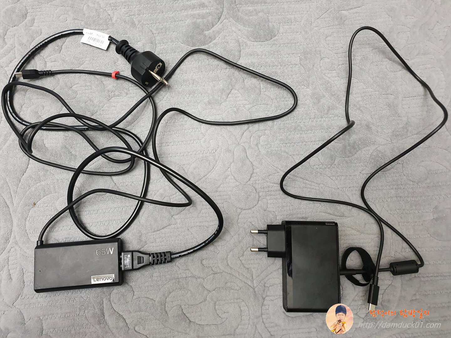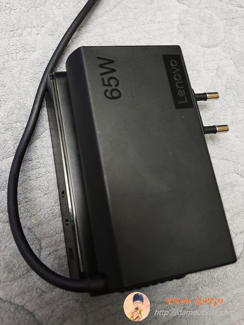 자 그럼 제가 Gan 멀티 충전기를 구매하게 된 Lenovo 65W 슬림 충전 어댑터와 비교를 해 볼까요. 어댑터만 놓고 보면 베이스어스 GaN2 Pro 120W 고속 PD 멀티 충전기 본체보다 작은 걸 알 수 있는데요. 케이블이 너무 크고 무겁습니다. 게다가 이 제품은 노트북 하나만 충전이 가능하잖아요.