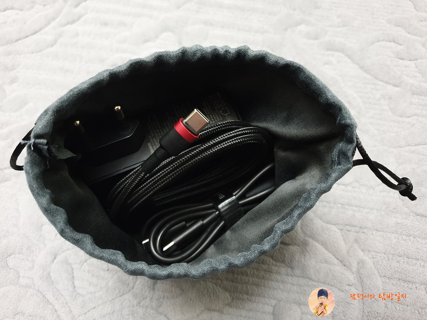 이 케이블까지 파우치 안에 모두 넣고 선을 당겨서 입구를 조여주면 확실히 부피가 많이 줄어듭니다. 충전기에 대한 고민은 베이스어스 GaN2 Pro 120W 고속 PD 멀티 충전기 하나로 당분간 없을 거 같네요. GaN 충전기를 찾고 계셨다면 할인 행사 끝나기 전에 구매하시는 것 나쁘지 않을 거 같습니다.