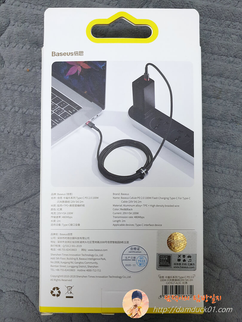 기본 구성품으로 제공되는 Type-C에서 Type-C로 가는 케이블 역시 100W를 지원하는 케이블입니다. 깔끔하게 Baseus가 인쇄된 정리용 벨크로까지 있는 케이블이네요.