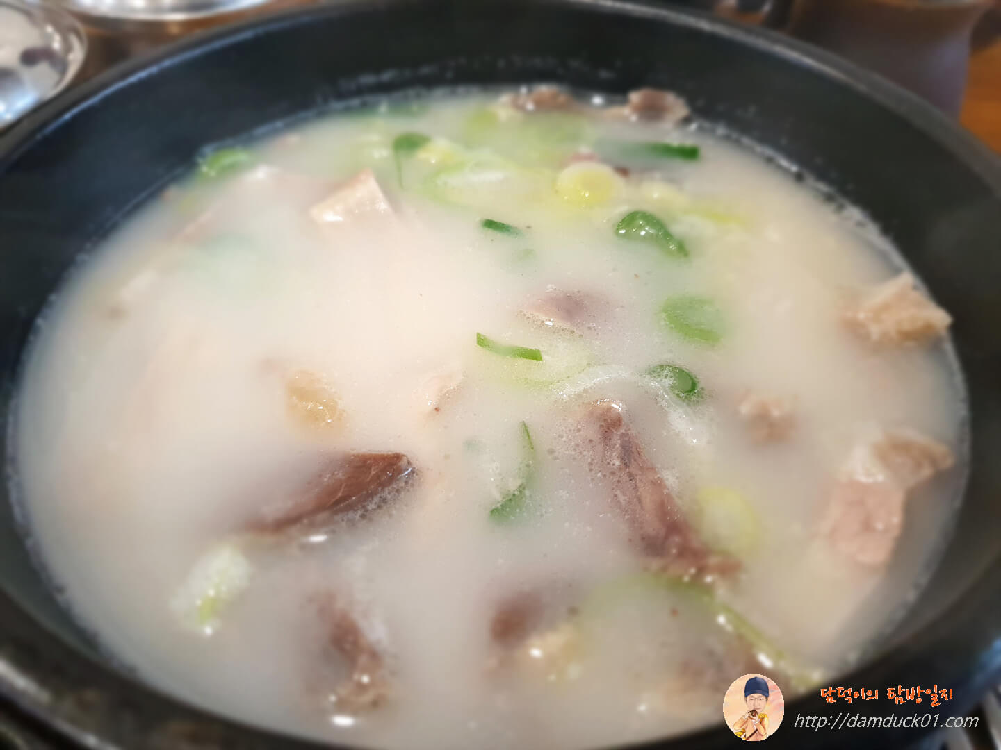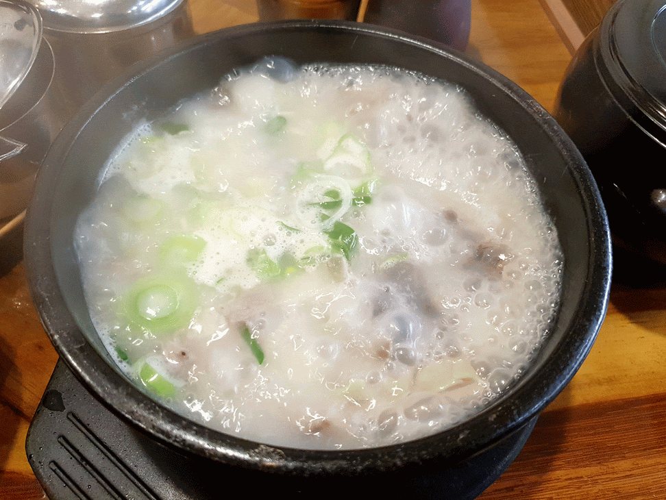 뽀얀 돼지 사골 국물이 바글바글 끓는 뚝배기가 나왔습니다.